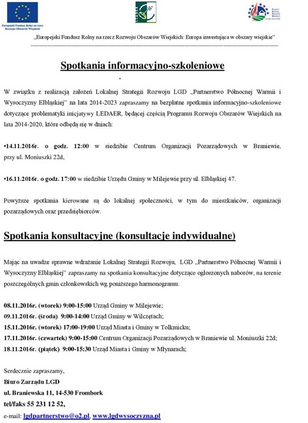 W imieniu Lokalnej Grupy Działania "Partnerstwo Północnej Warmii i Wysoczyzny Elbląskiej" zapraszamy na spotkania konsultacyjne (konsultacje indywidualne), które odbedą się w następujących terminach: