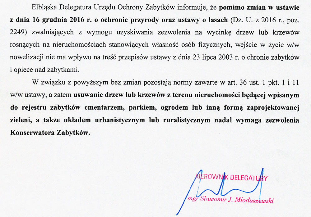 Informacja Konserwatora Zabytków dot. usuwania drzew