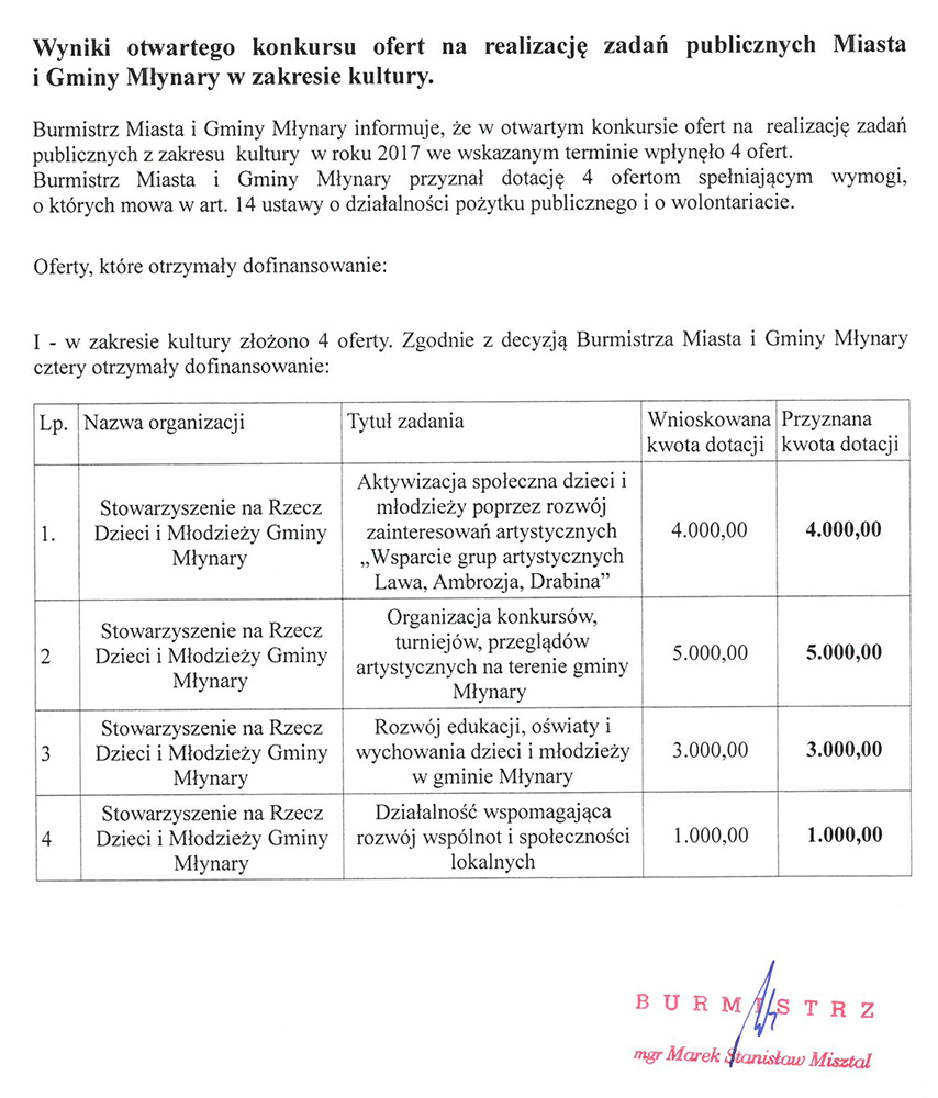 Wyniki otwartego konkursu na realizację zadań publicznych Miasta i Gminy Młynary w zakresie kultury