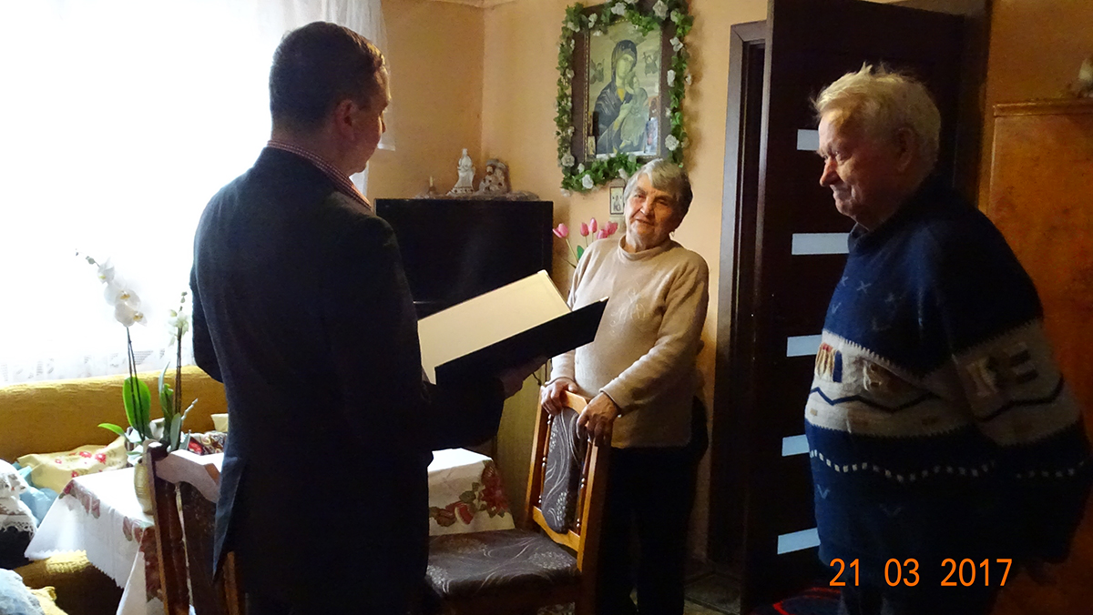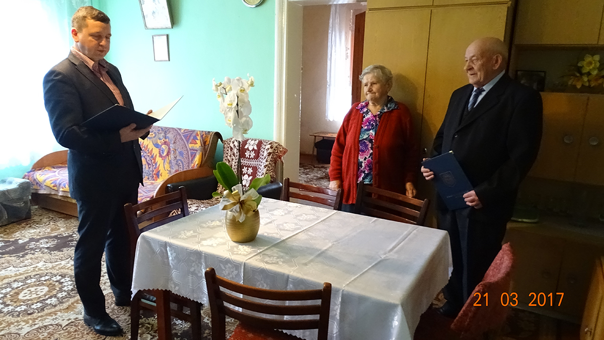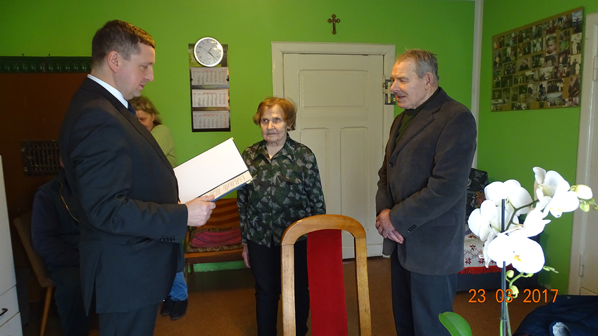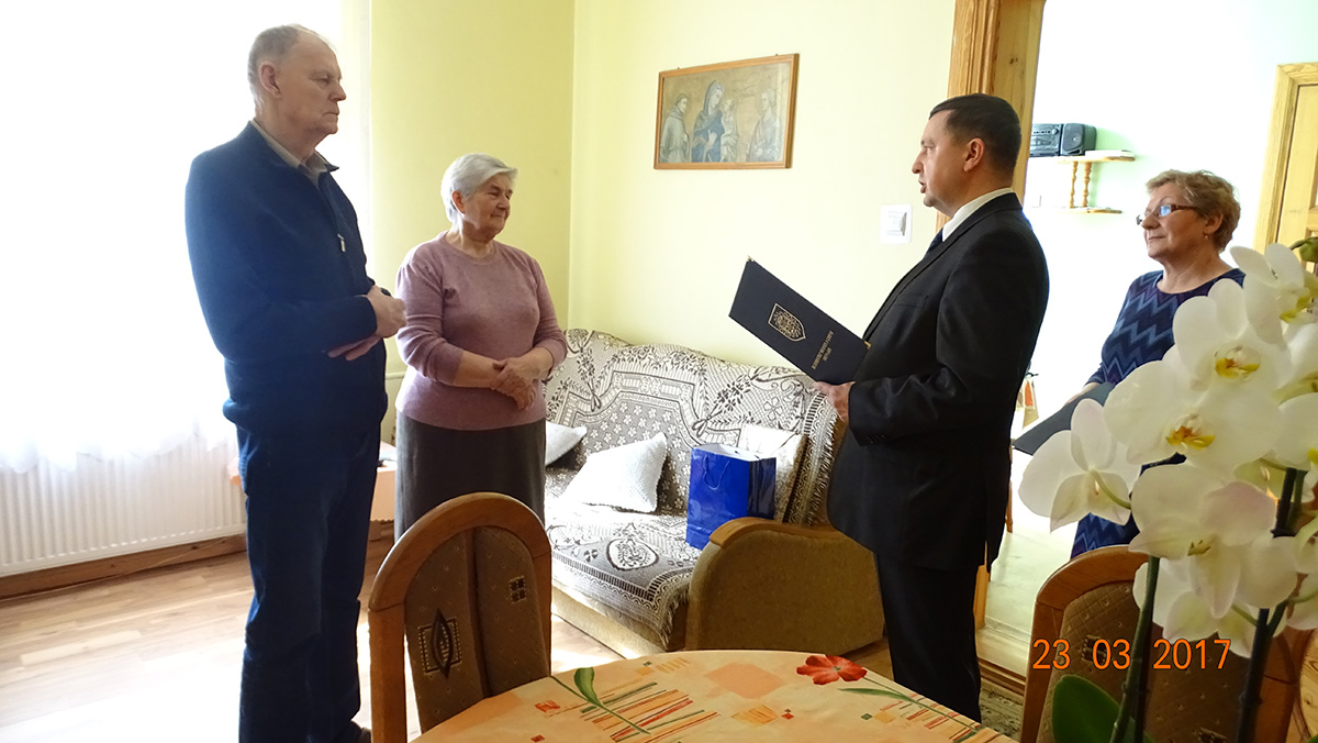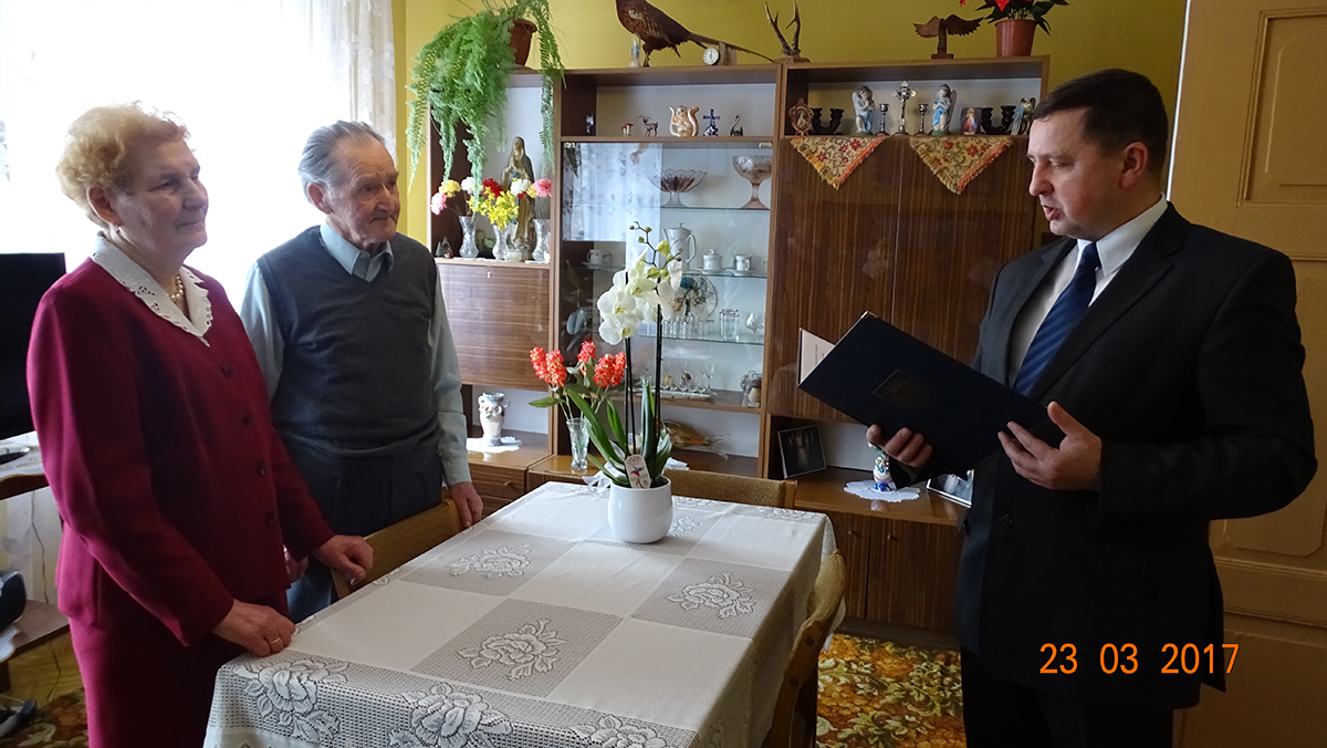 Pan Burmistrz wręczył jubilatom okolicznościowe dyplomy, kwiaty oraz drobne upominki. Podziękował za lata wspólnego życia, prowadzenia wspólnej drogi przez kręte ścieżki rzeczywistości. Wyraził przekonanie, że swoją postawą i pracą rozwijali rodziny i własne środowiska. Złożył serdeczne życzenia kolejnych pięknych jubileuszy. Przekazał gratulacje od Pana Artura Chojeckiego Wojewody Warmińsko- Mazurskiego.