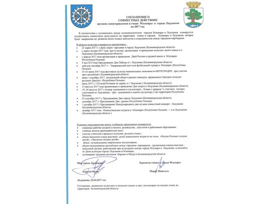 Podpisanie porozumienia w ramach wspólnego działania samorządu Gminy Młynary oraz Miasta Ladushkin na 2017 r.