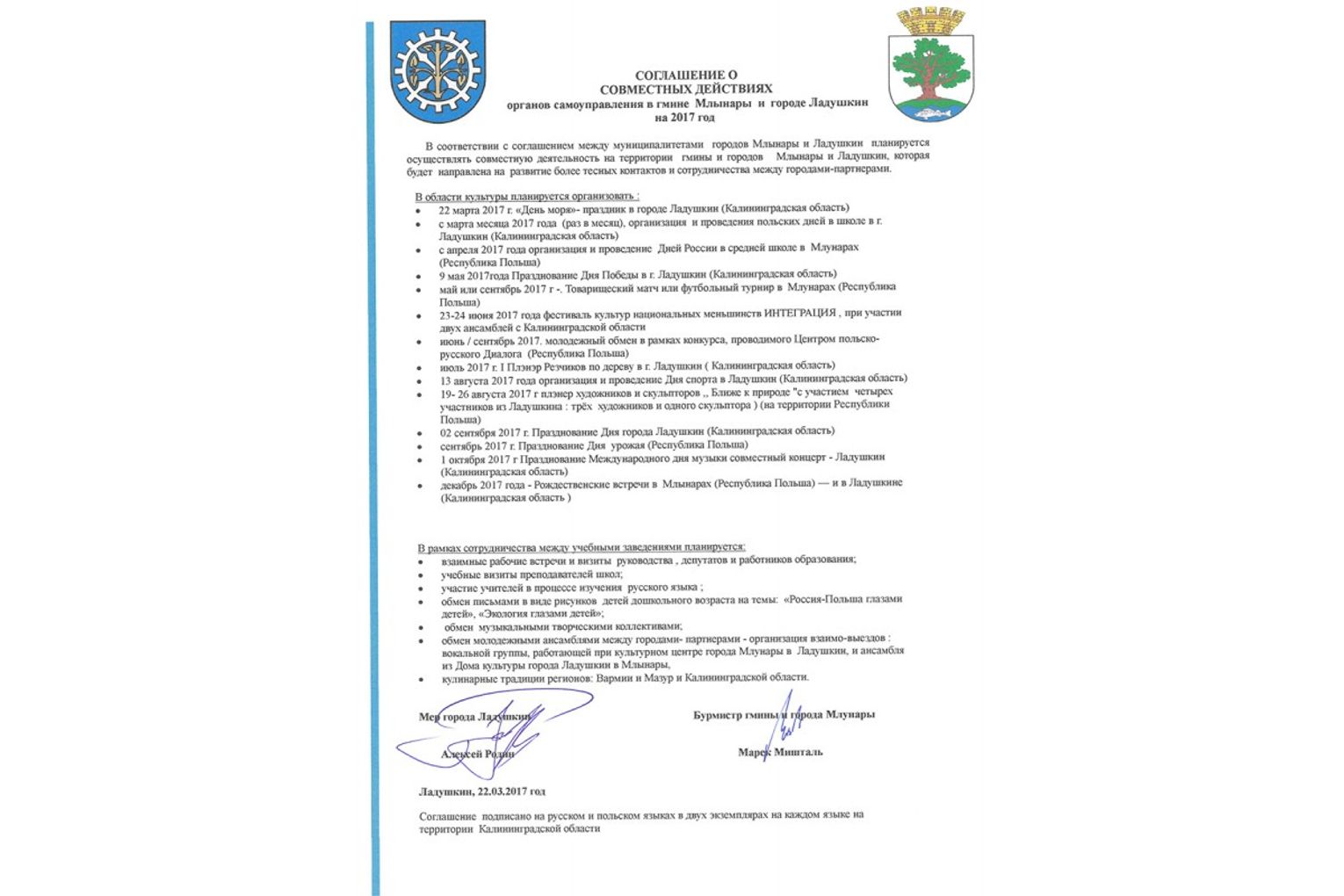 Wizyta miała na celu ,,PODPISANIE POROZUMIENIA W RAMACH WSPÓLNEGO DZIAŁANIA SAMOTRZĄDU GMINY MŁYNARY ORAZ MIASTA LADUSHKIN NA 2017 ROK” połączonej z obchodami ,,Dni Morza” w mieście Ladushkin.