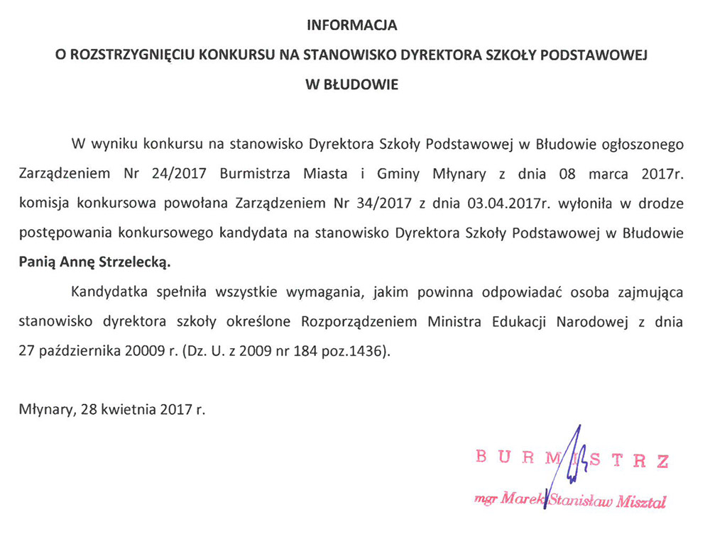 Informacja o rozstrzygnięciu konkursu na stanowisko Dyrektora Szkoły Podstawowej w Błudowie