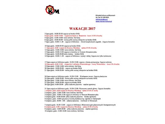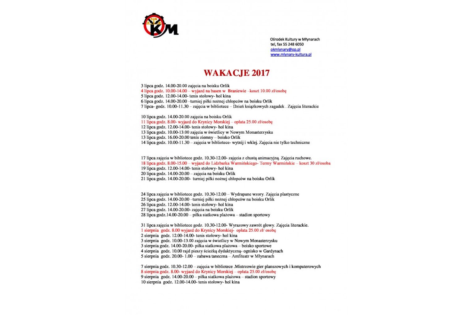 WAKACJE Z OŚRODKIEM KULTURY- ZAPISY NA WYJAZDY DOKONYWAĆ OSOBIŚCI W OŚRODKU KULTURY
