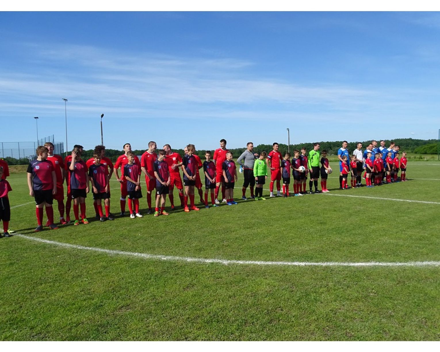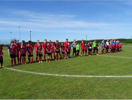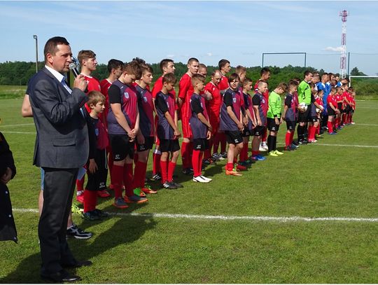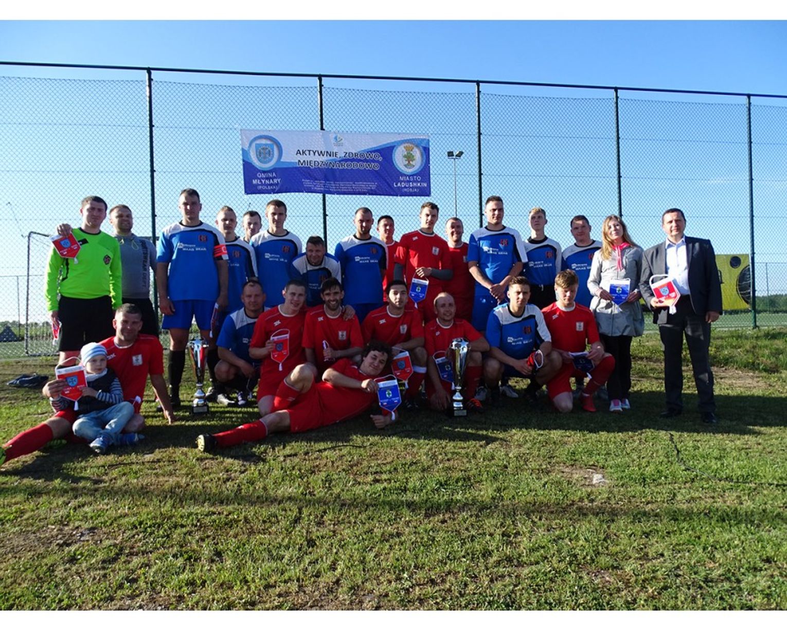 Na koniec spotkania Pan Burmistrz wręczył pamiątkowe proporczyki oraz puchary dla kapitanów obu drużyn. Na pamiątkę spotkania zrobiono wspólne zdjęcie.