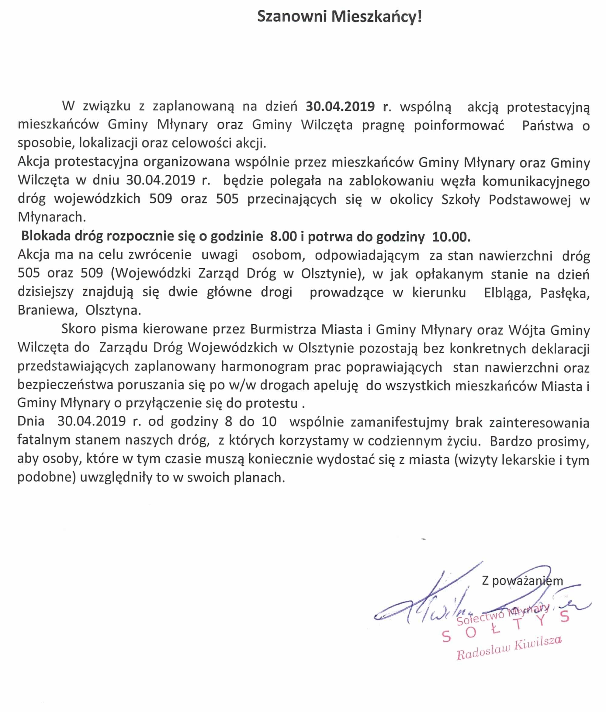 Informaja Sołtysa Młynar w sprawie blokady dróg
