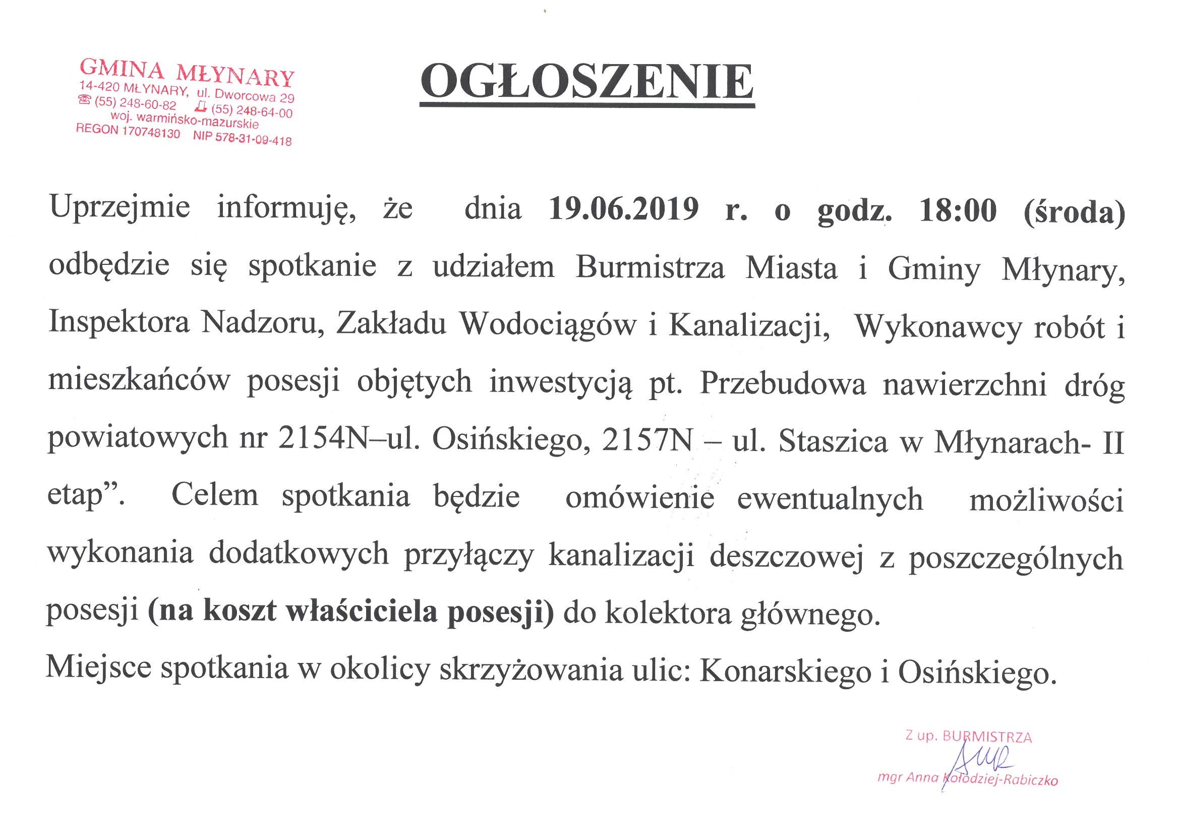 Ogłoszenie o spotkaniu dotyczącym przebudowy dróg na ul. Staszica i Osińskiego