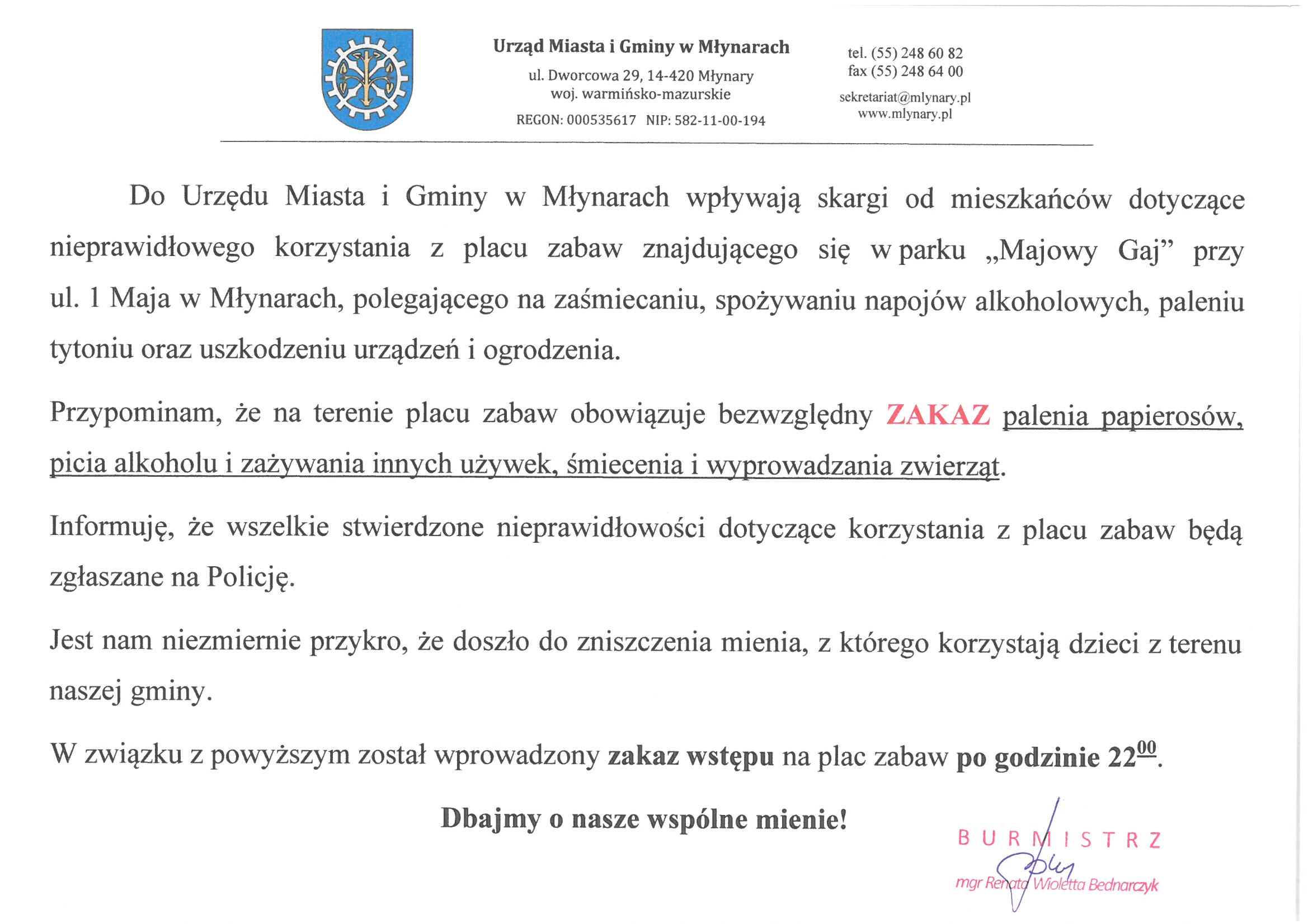 Informacja dot. parku "Majowy Gaj" w Młynarach