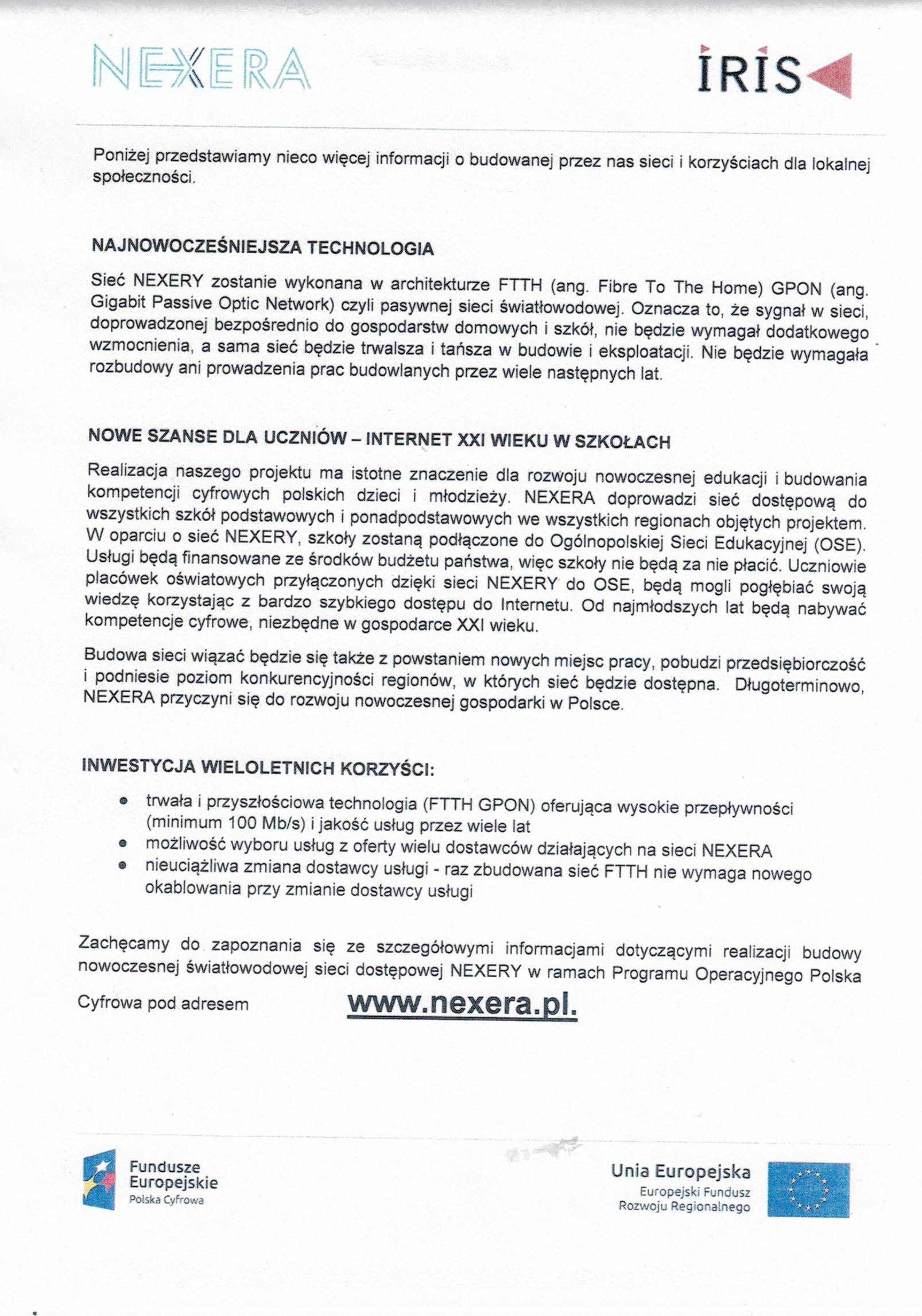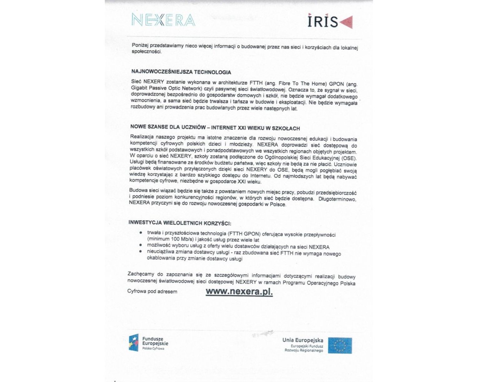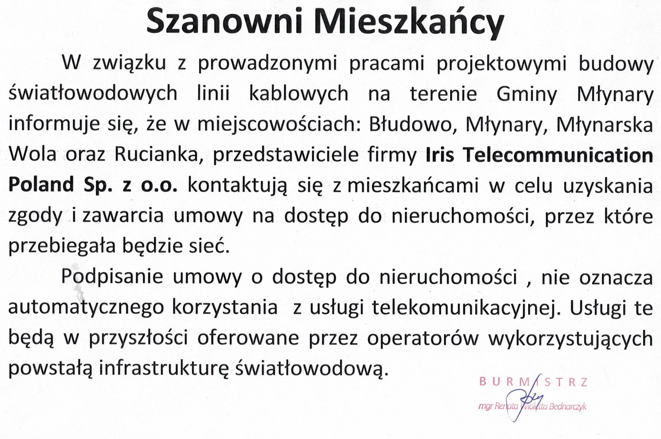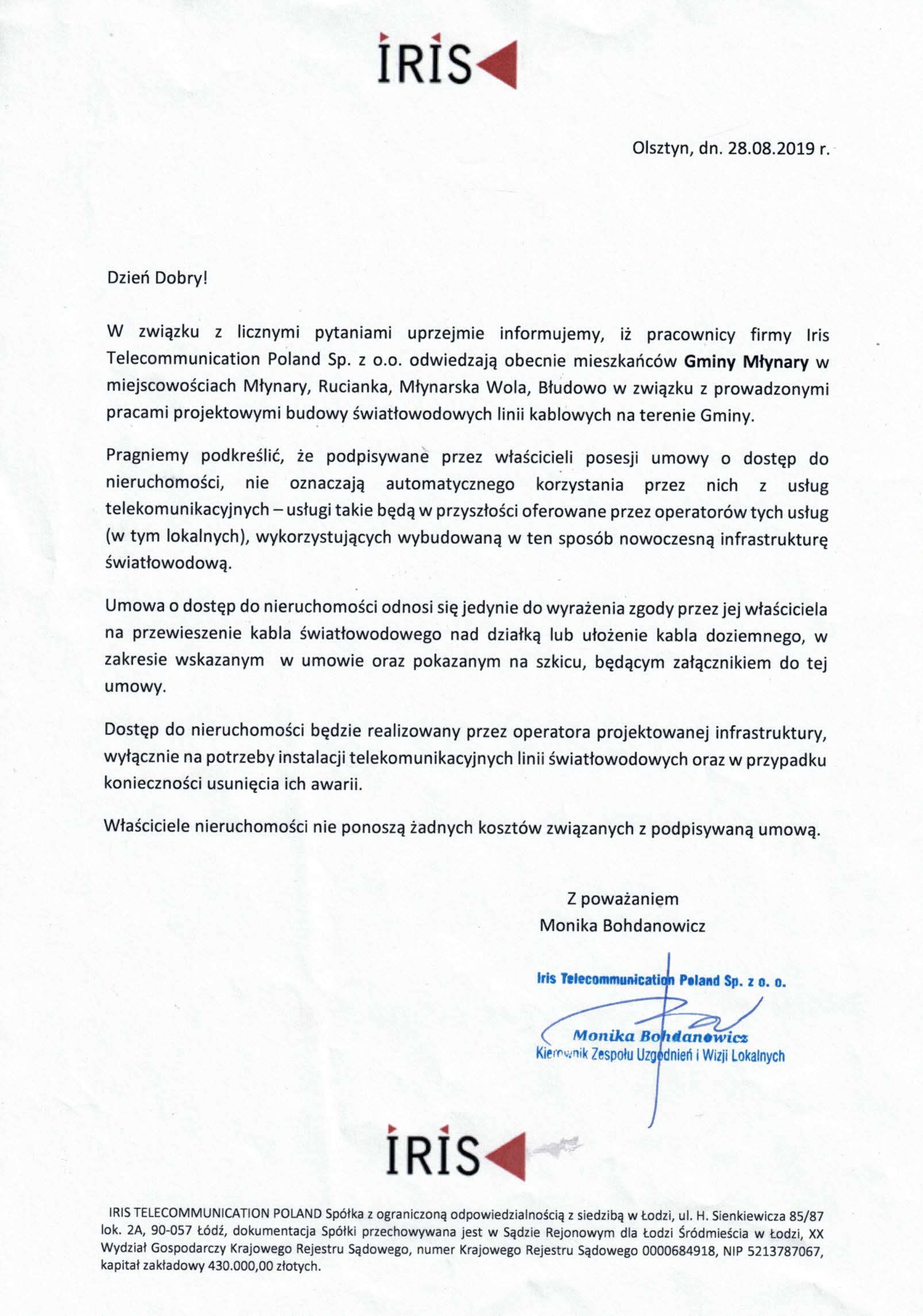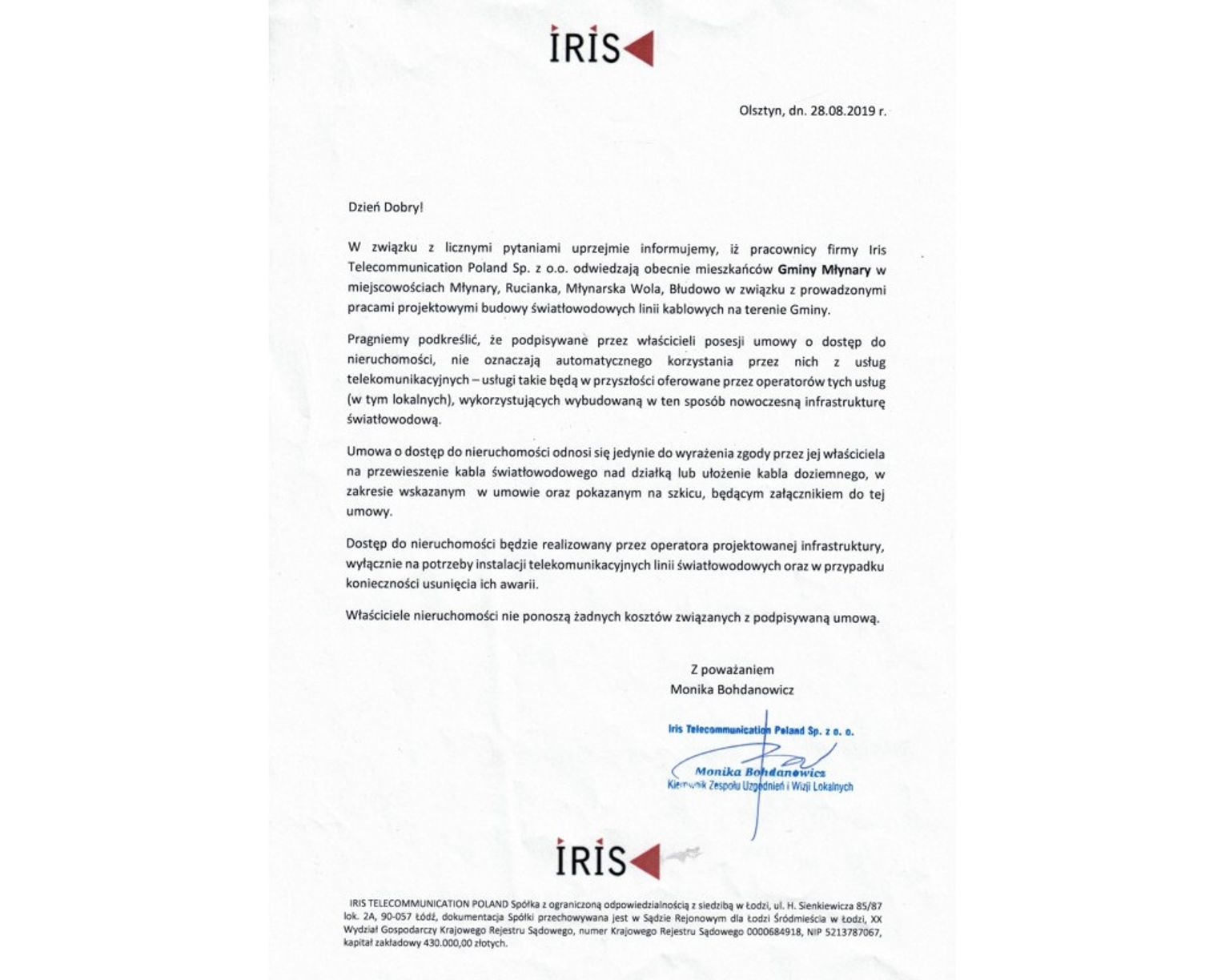 Pismo informacyjne Iris Telecommunication Poland Sp. z o.o.