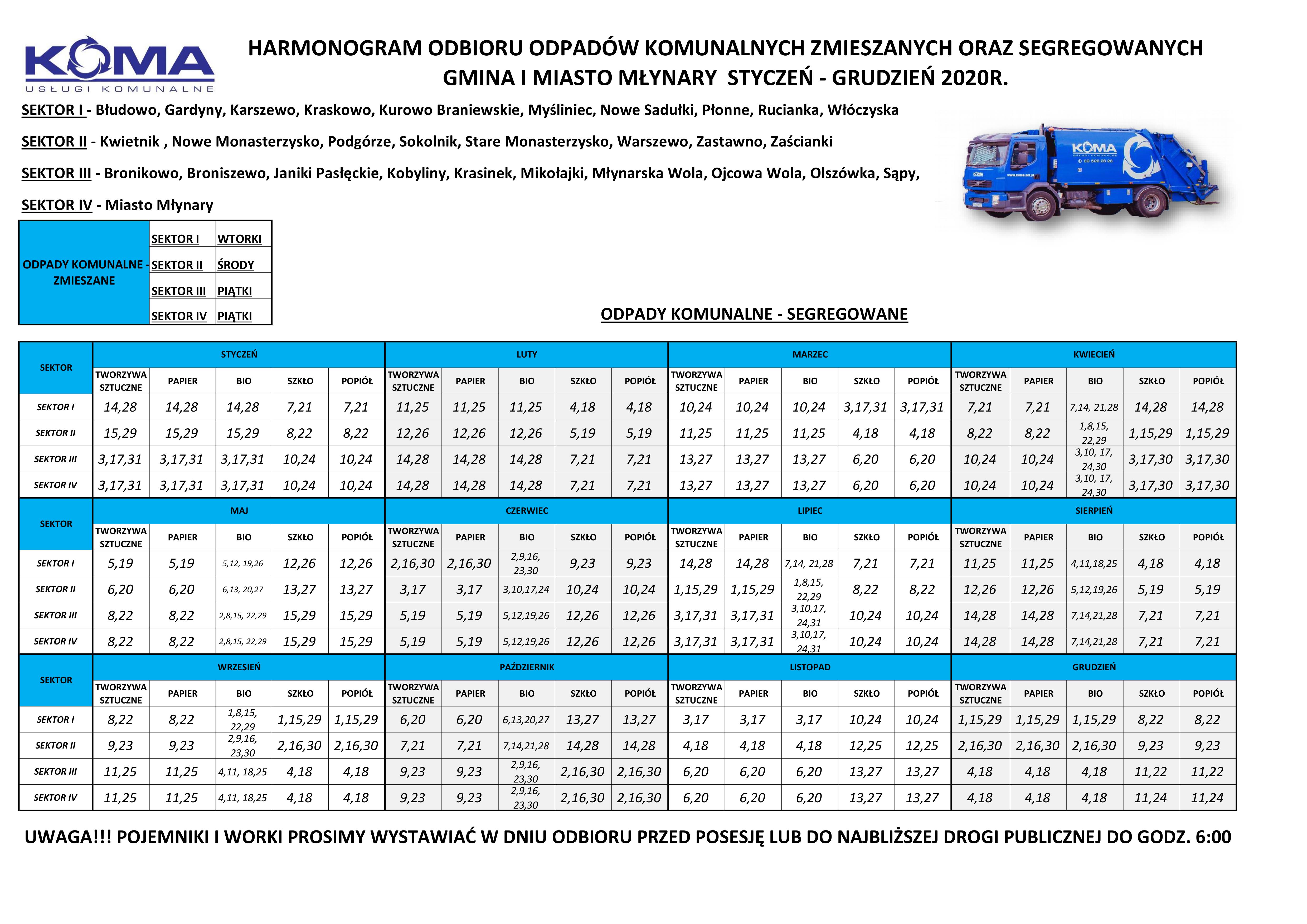Harmonogram odbioru odpadów komunalnych na 2020 r.
