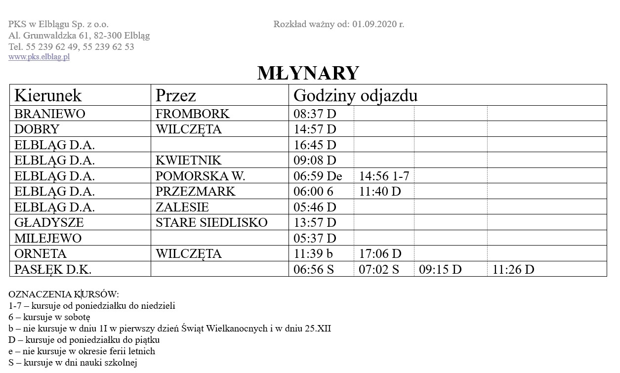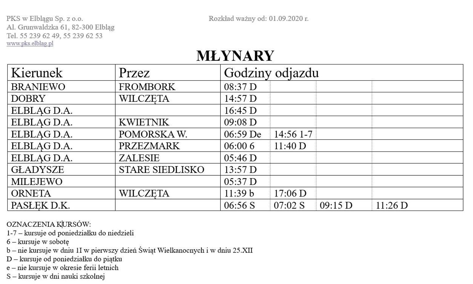 Rozkład jazdy autobusów PKS. Przystanek: Młynary (Rynek)