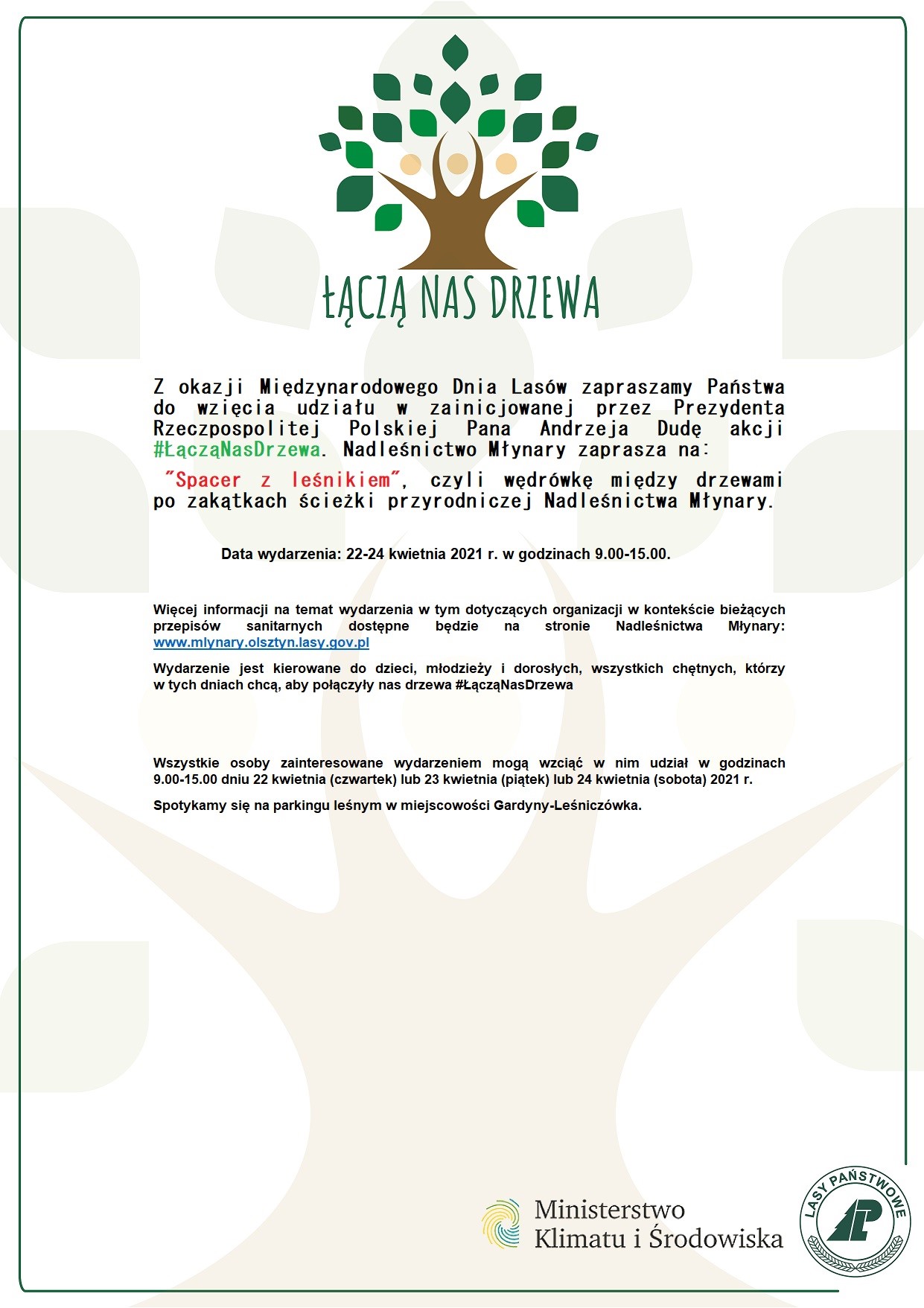 Z okazji Międzynarodowego Dnia Lasów zapraszamy Państwa do wzięcia udziału w zainicjowanej przez Prezydenta Rzeczpospolitej Polskiej Pana Andrzeja Dudę akcji #ŁącząNasDrzewa. Nadleśnictwo Młynary zaprasza na „Spacer z leśnikiem” – czyli wędrówkę między drzewami po zakątkach ścieżki przyrodniczej Nadleśnictwa Młynary.