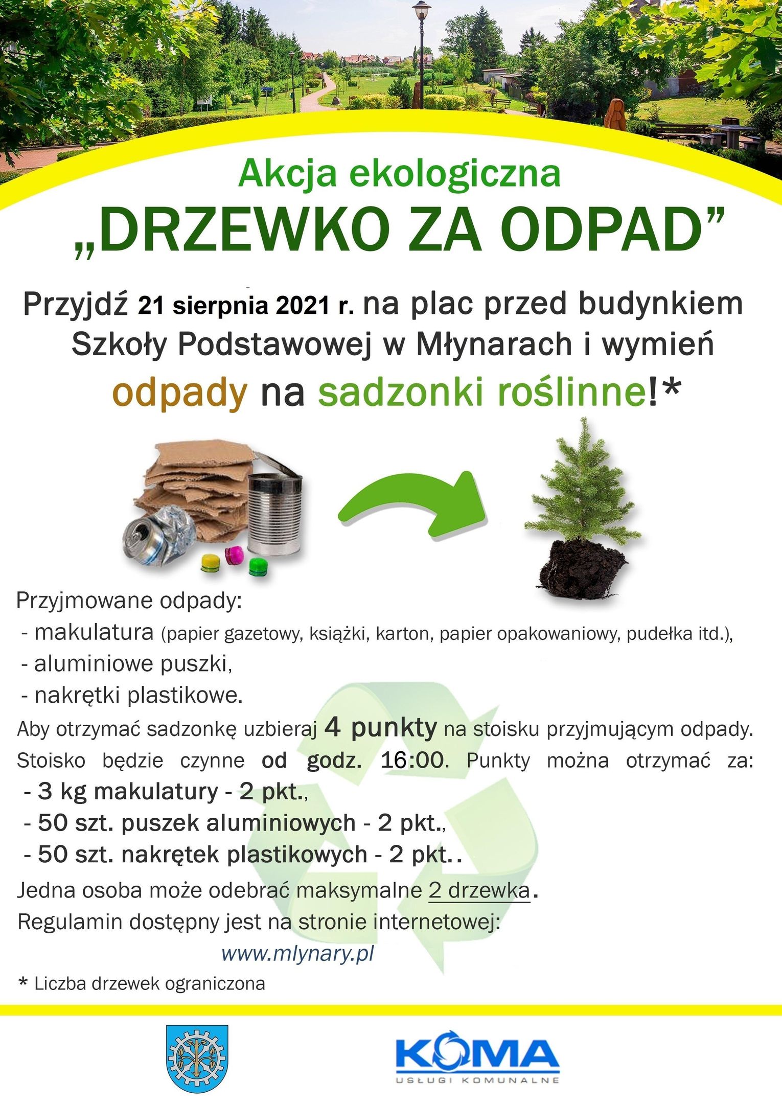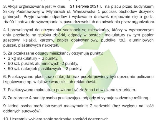 - Akcja organizowana jest w dniu 21 sierpnia 2021 r. na placu przed budynkiem Szkoły Podstawowej w Młynarach ul. Warszawska 1 podczas obchodów dożynek gminnych. Przyjmowanie odpadów i wydawanie drzewek rozpocznie się o godz. 16:00 i potrwa do wyczerpania zapasu drzewek lub do odwołania przez organizatora.