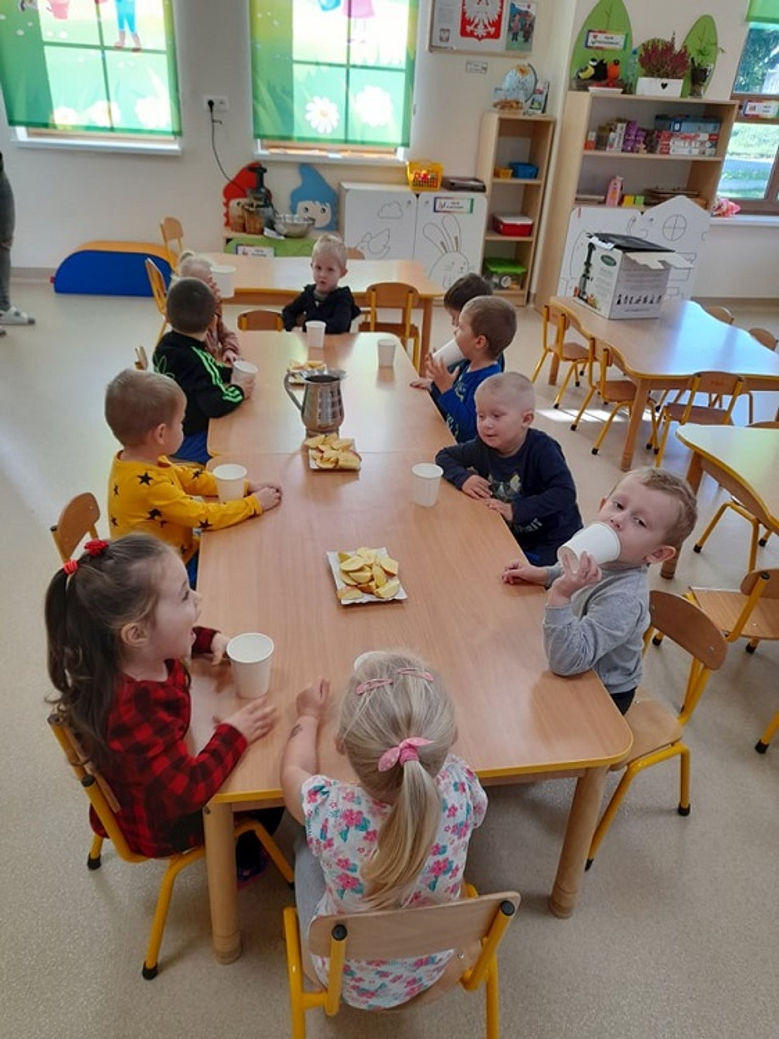 28 września celebrowaliśmy natomiast Dzień Jabłka. Nasze świętowanie rozpoczęliśmy od rozmów na temat wyglądu jabłek, kolorów, wielkości, kształtu, smaku, różnych odmian, dlaczego warto je jeść i co można z nich zrobić. Wszystkie kolejne zabawy w tym dniu dotyczyły oczywiście jabłek. Dzieci wykonały piękne prace plastyczne oraz przy pomocy pani Karoliny (naszej woźnej) pyszny sok jabłkowy, który wypiły z wielkim smakiem.