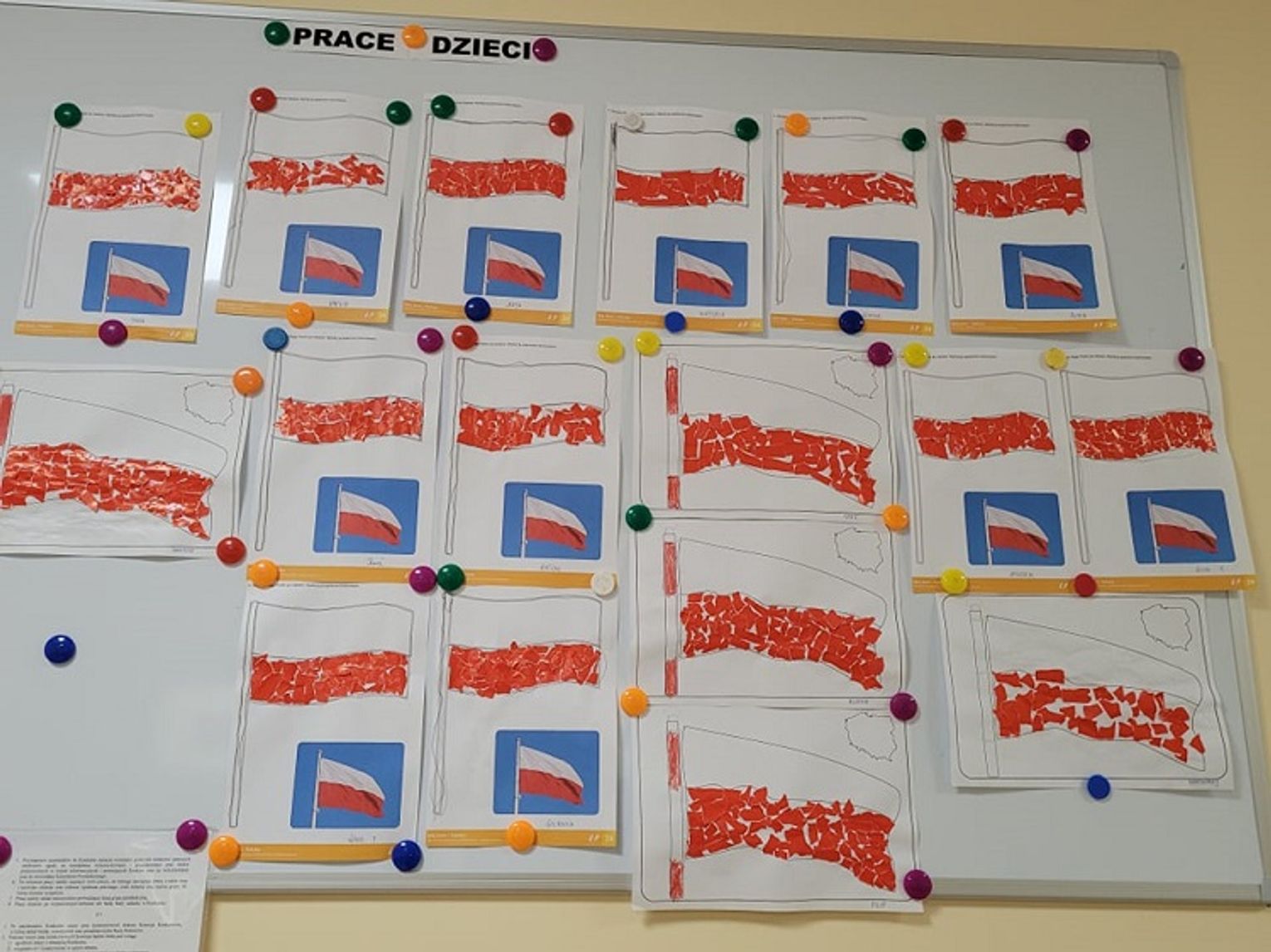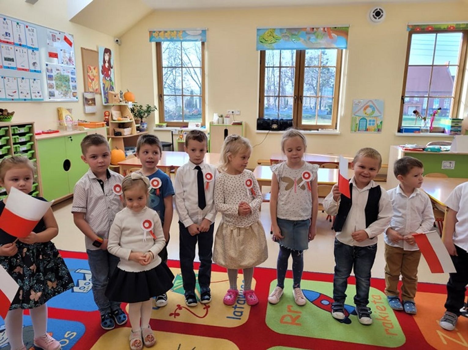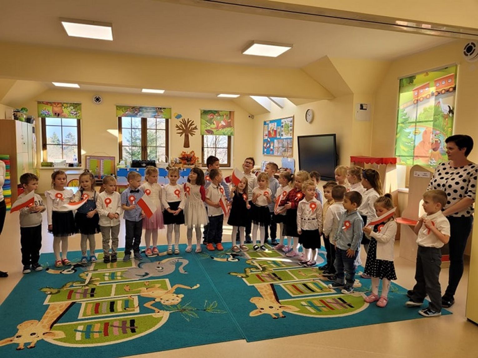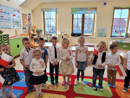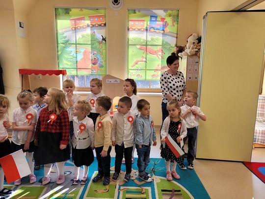 Od początku tygodnia we wszystkich grupach odbywały się zajęcia związane z takimi zagadnieniami, jak: Polska, Polak/ Polka, patriotyzm i wolność. Nauczycielki rozmawiały z dziećmi o naszych symbolach narodowych, zapoznały je z mapą Polski, a także przedstawiły okoliczności powstania Warszawy, czytając "Legendę o Warsie i Sawie". Przedszkolaki miały również okazję porozmawiać na temat swoich rodzimych miejscowości, które są naszymi małymi Ojczyznami. Dzieci wykonały różnego rodzaju prace plastyczne przedstawiające naszą flagę i godło, a podsumowaniem naszego patriotycznego tygodnia stał się udział w akcji "Szkoła do hymnu" - 10 listopada o godzinie 11:11 cztery grupy, a mianowicie "Motylki", "Misie", "Wiewiórki" i "Liski urwiski" wraz nauczycielkami i pracownikami obsługi odśpiewały wszystkie zwrotki hymnu narodowego. Było bardzo uroczyście i wzruszająco!