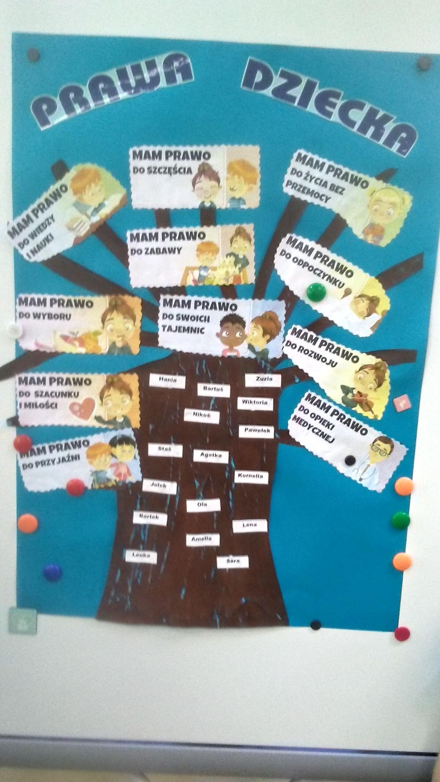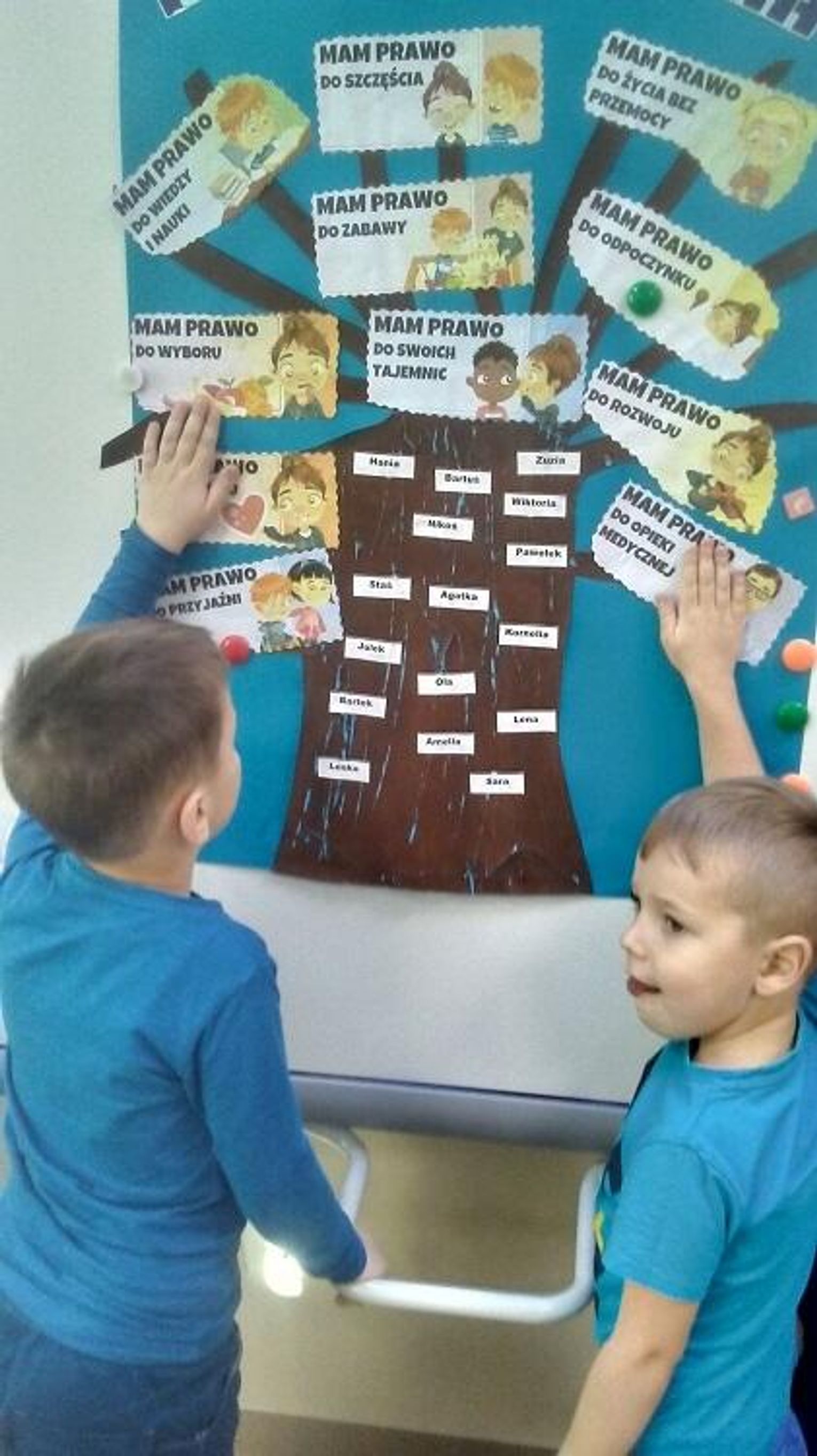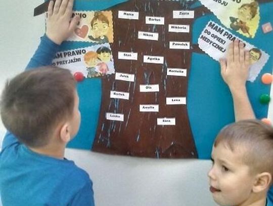 W poniedziałek 22 listopada grupa "Motylki" obchodziła Ogólnopolski Dzień Praw Dziecka. Była to doskonała okazja do realizacji ciekawych i rozwijających zajęć uzupełniających wiedzę dzieci na temat praw najmłodszych obywateli. Z tej okazji obejrzały film oraz wysłuchały wiersza na temat „Praw i obowiązków dziecka”. Dzieci wypowiadały się o swoich prawach i najważniejszym, w ich odczuciu, jest prawo do miłości. Chętnie mówiły też o prawie do zabawy, do radości i innych uczuć. Podsumowaniem zajęć była praca plastyczna „Drzewko praw dzieci”, które było podziwiane przez rodziców.