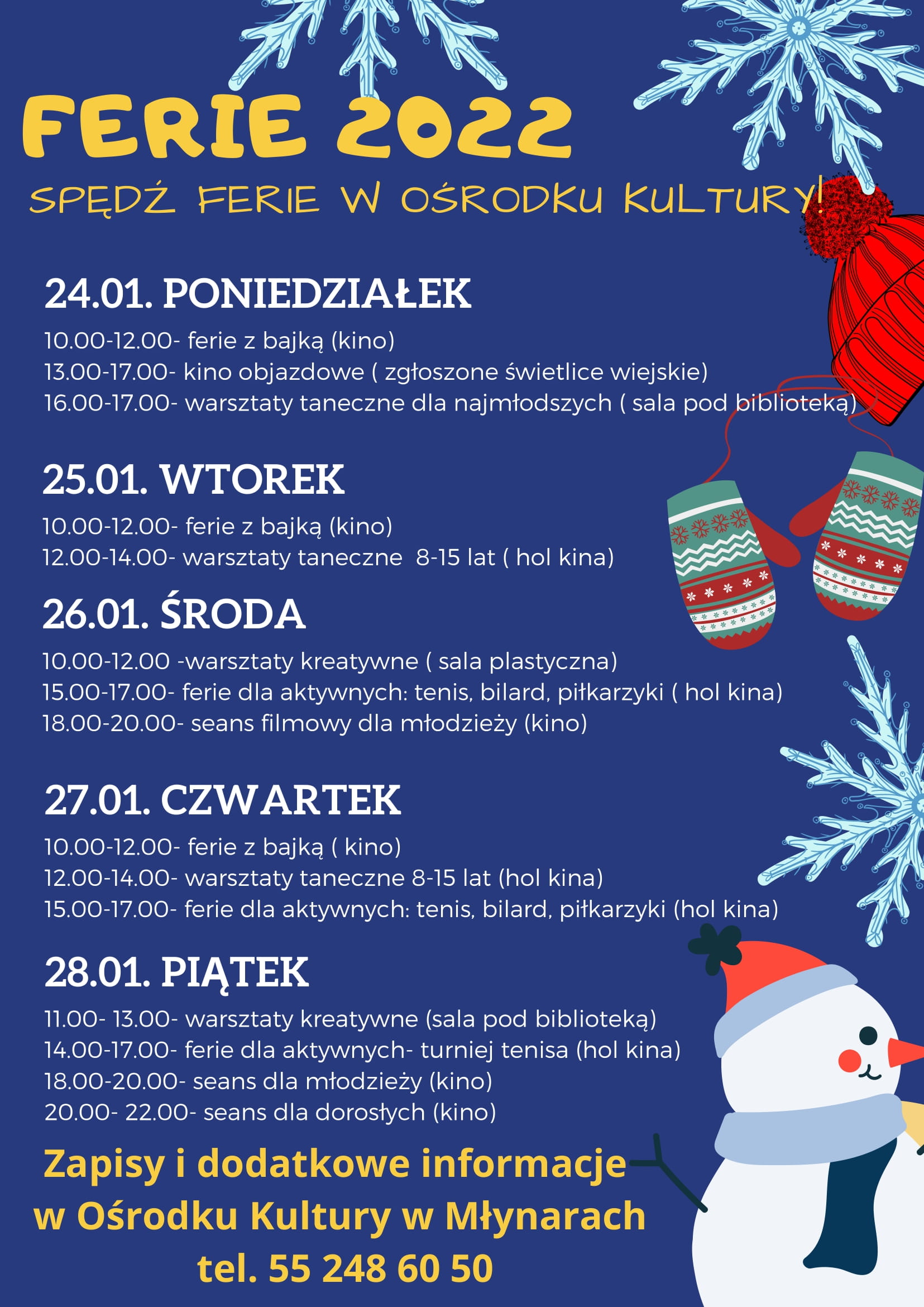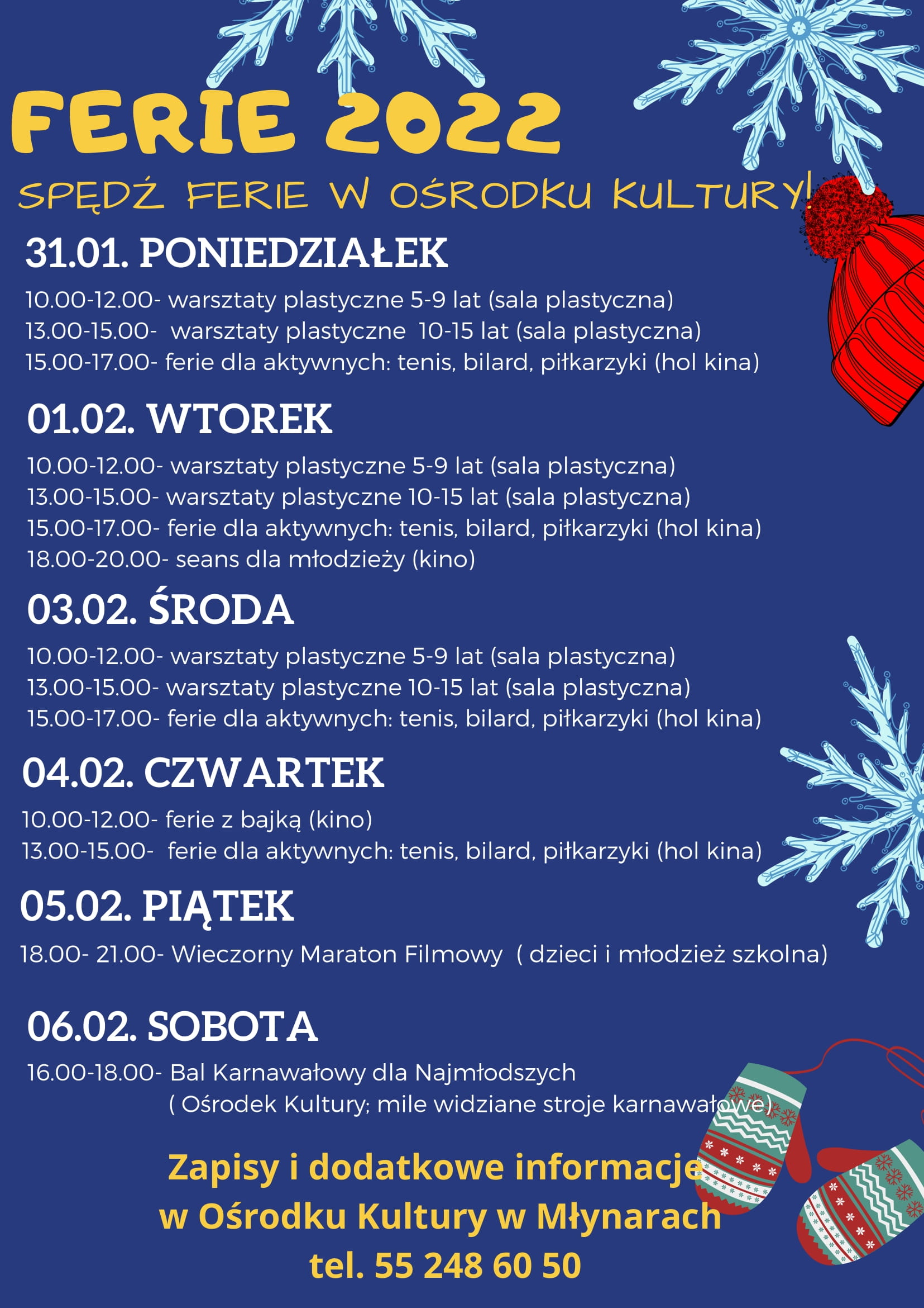 Ośrodek Kultury w Młynarach zaprasza dzieci i młodzież na zajęcia w okresie ferii zimowych. Ze względu na epidemię obowiązują wcześniejsze zapisy. W czwartek 27.01. istnieje możliwość organizacji dowozu dzieci z terenów wiejskich po uprzednim zgłoszeniu chęci uczestnictwa w zajęciach. Regulamin zajęć feryjnych dostępny u Organizatora. Zapisy i dodatkowe informacje w Ośrodku Kultury w Młynarach tel.: 55 248 60 50. Zapraszamy!-1.jpg)