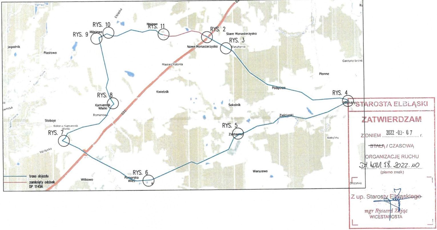 W dniu 14.03.2022 r. zostanie wprowadzona czasowa organizacja ruchu w ciągu drogi powiatowej nr 1145N na odcinku od miejscowości Majewo do wiaduktu nad drogą S22, zgodna z zatwierdzonym projektem nr DM.4021.58.2022.WO z dnia 07.03.2022 r.