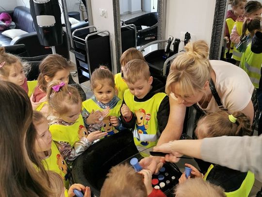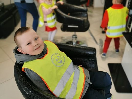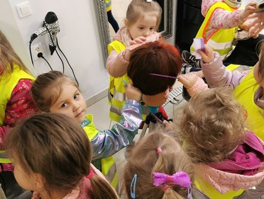 Dzięki uprzejmości pani Moniki - mamy Hani i Zosi z naszej grupy, przedszkolaki poznały akcesoria, wykorzystywane przez fryzjera w codziennej pracy, i dokładnie obejrzały sprzęt znajdujący się w salonie - największą frajdę sprawiły im kręcone fotele, na których każdy musiał usiąść chociaż na chwilkę.