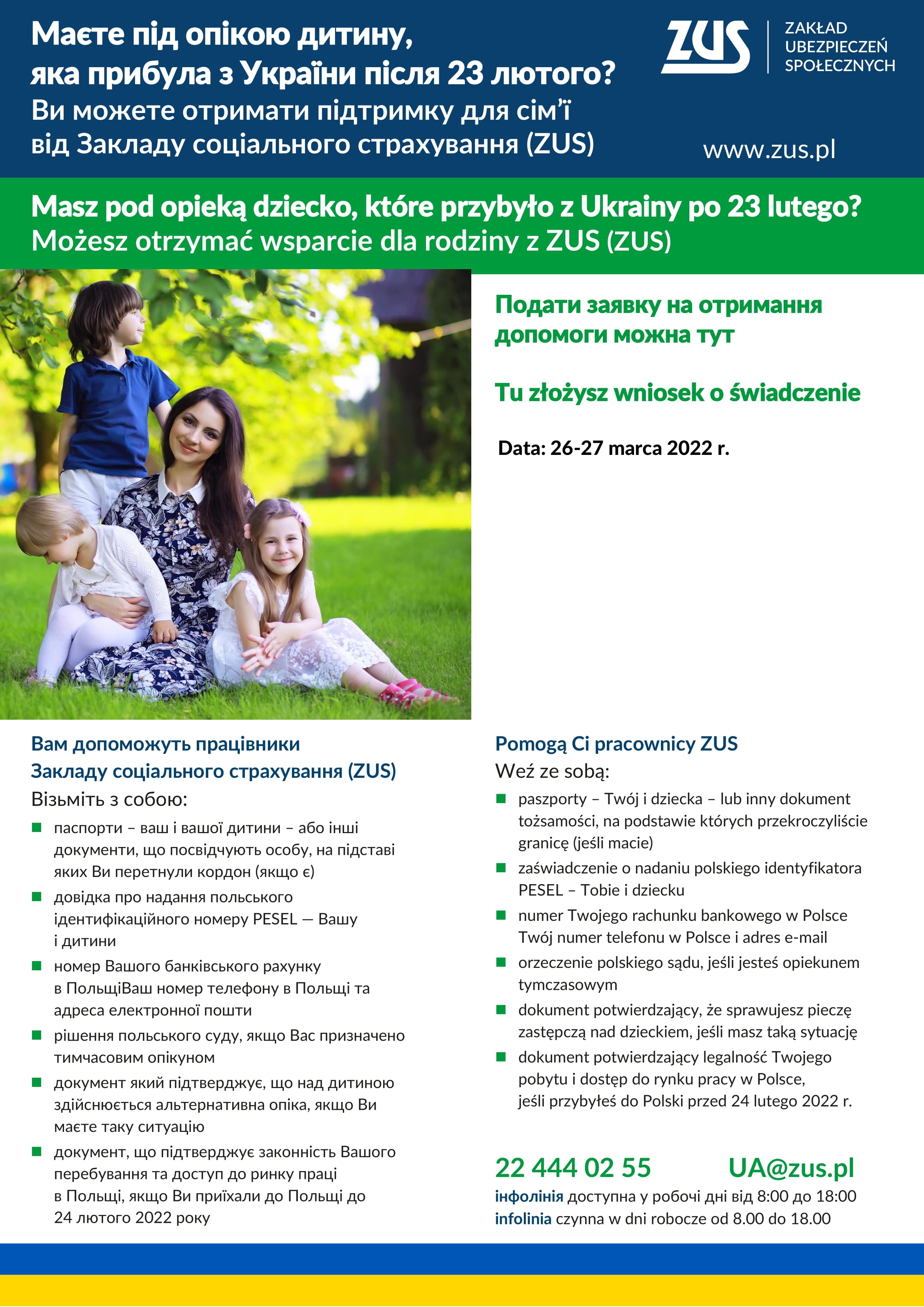 Obywatelom Ukrainy, którzy wjechali legalnie z Ukrainy do Polski po 23 lutego 2022 r. w związku z działaniami wojennymi i chcą pozostać w Polsce, Zakład Ubezpieczeń Społecznych będzie przyznawał i wypłacał świadczenia dla rodziny.