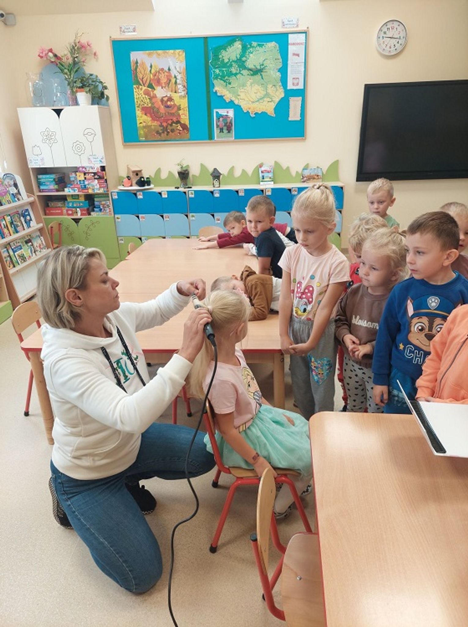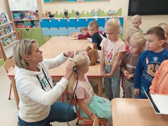 Pani Kinga nie tylko opowiedziała dzieciom o swojej pracy, ale także pokazała im wykorzystywane przez siebie akcesoria (nożyczki, grzebienie, szczotki, pelerynę, suszarkę, lokówkę) i urządziła mały pokaz swoich umiejętności, co wywołało wśród "Pszczółek" mnóstwo emocji.