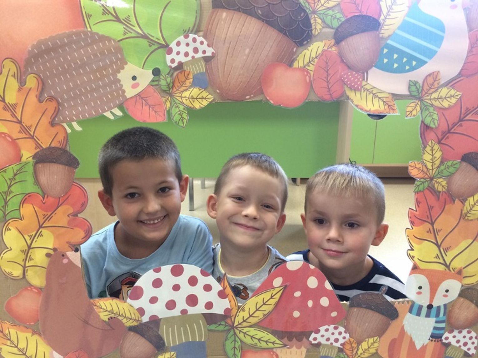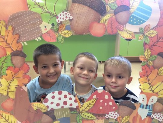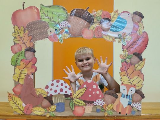 Pozostałe grupy szukały oznak nadejścia jesieni w okolicy przedszkola, a na pamiątkę tego dnia zrobiły sobie zdjęcie w jesiennej "fotobudce" przygotowanej przez p. Agatę Frąckiewicz.