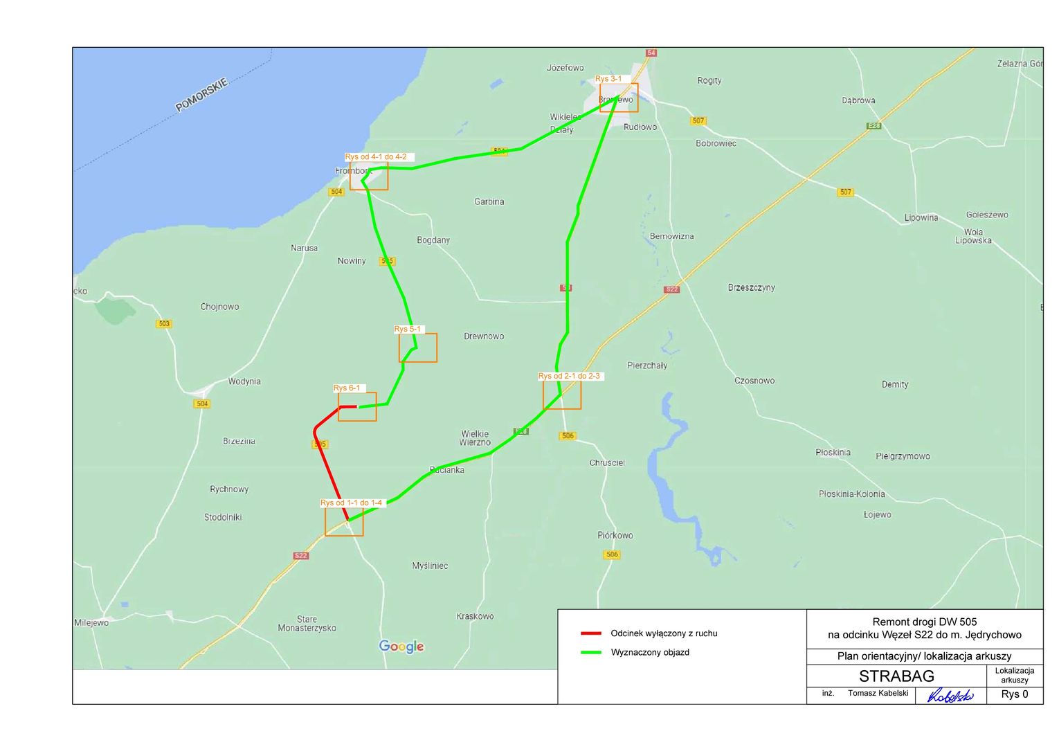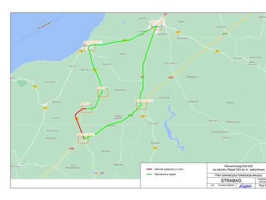 STRABAG Sp. z o.o., jako Wykonawca robót pn. „Remont drogi 505 na odcinku Jędrychowo - węzeł S22” przekłada schemat objazdu na czas zamknięcia odcinka drogi DW 505. Przewidywany termin wprowadzenia schematu od dnia 07.11.2022 r.