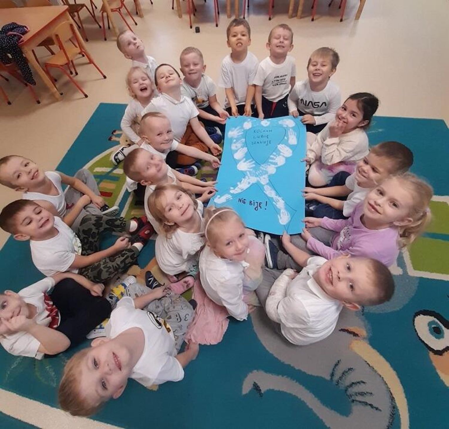 My w swoich działaniach skupiłyśmy się jednak na tym, aby pokazać dzieciom, jak radzić sobie za złością, która często staje się przyczyną agresywnych zachowań. Przedszkolaki rozmawiały m.in. o tym, jak można rozwiązywać konflikty bez stosowania przykrych słów i bicia, a także o mocy trzech magicznych słów: proszę, przepraszam i dziękuję. Dzieci opisywały obrazki, na których przedstawione były różne sytuacje i dyskutowały, które z nich są właściwe, a które nie i dlaczego. Podsumowaniem dyskusji było stworzenie plakatów ilustrujących białą wstążkę, a podkreśleniem sprzeciwu wobec jakiejkolwiek formy przemocy - biały ubiór.