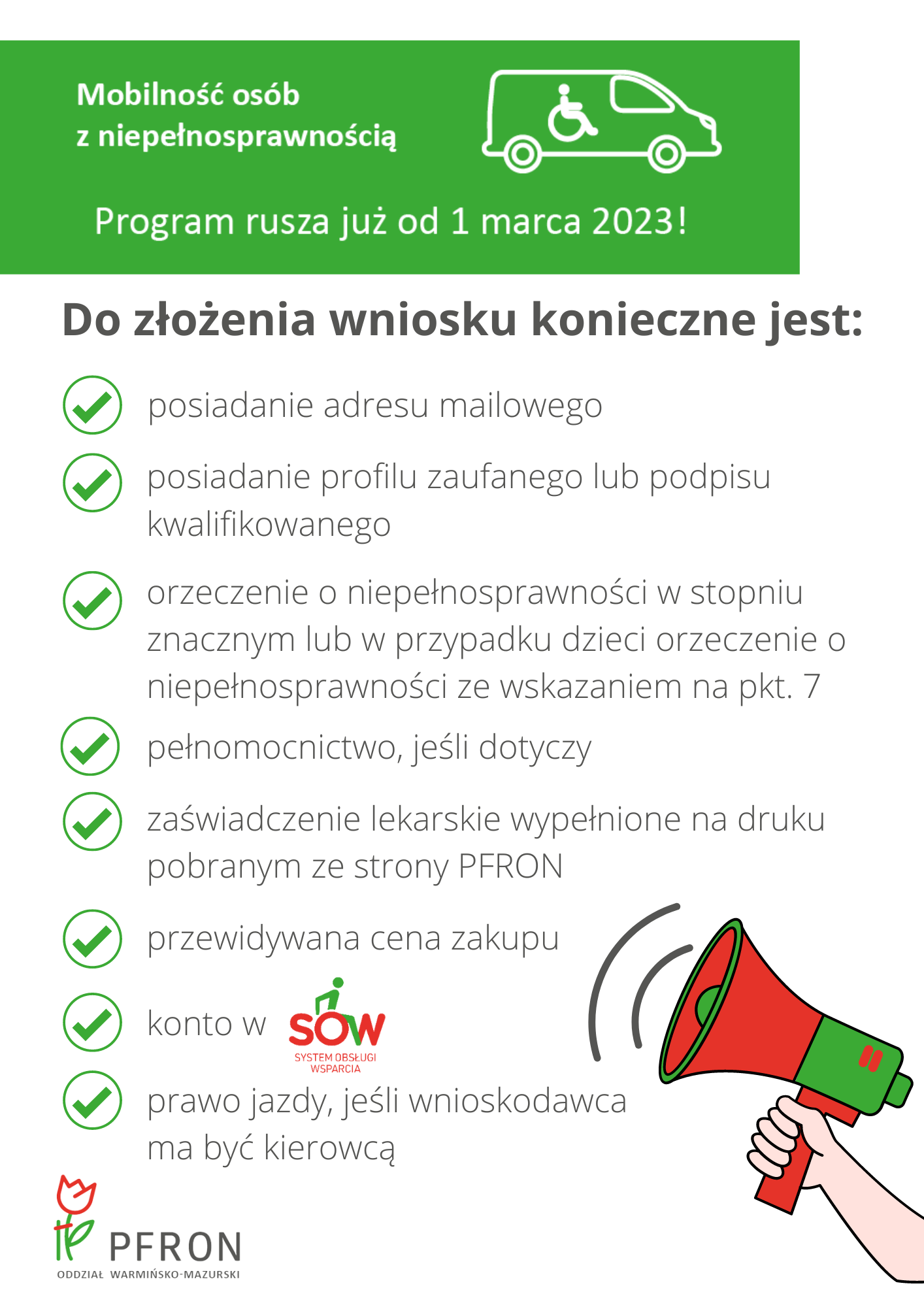 Celem programu „Samodzielność – Aktywność – Mobilność!” Mobilność osób z niepełnosprawnością jest wzrost niezależności beneficjentów oraz ułatwienie im aktywności społecznej lub zawodowej poprzez zapewnienie dostępu do korzystania z samochodu osobowego. Dofinansowanie dotyczy części kosztów zakupu dostosowanego samochodu osobowego. tj. pojazdu, w którym dokonano technicznych dostosowań pod kątem indywidualnych potrzeb kierowcy lub pasażera z niepełnosprawnością uniemożliwiającą poruszanie się bez użycia wózka inwalidzkiego w sposób, który umożliwia zajęcie miejsca kierowcy lub pasażera bez konieczności przesiadania się z wózka inwalidzkiego. Zarówno kierowca jak i pasażer korzystają z dostosowanego samochodu podróżując na wózku inwalidzkim.