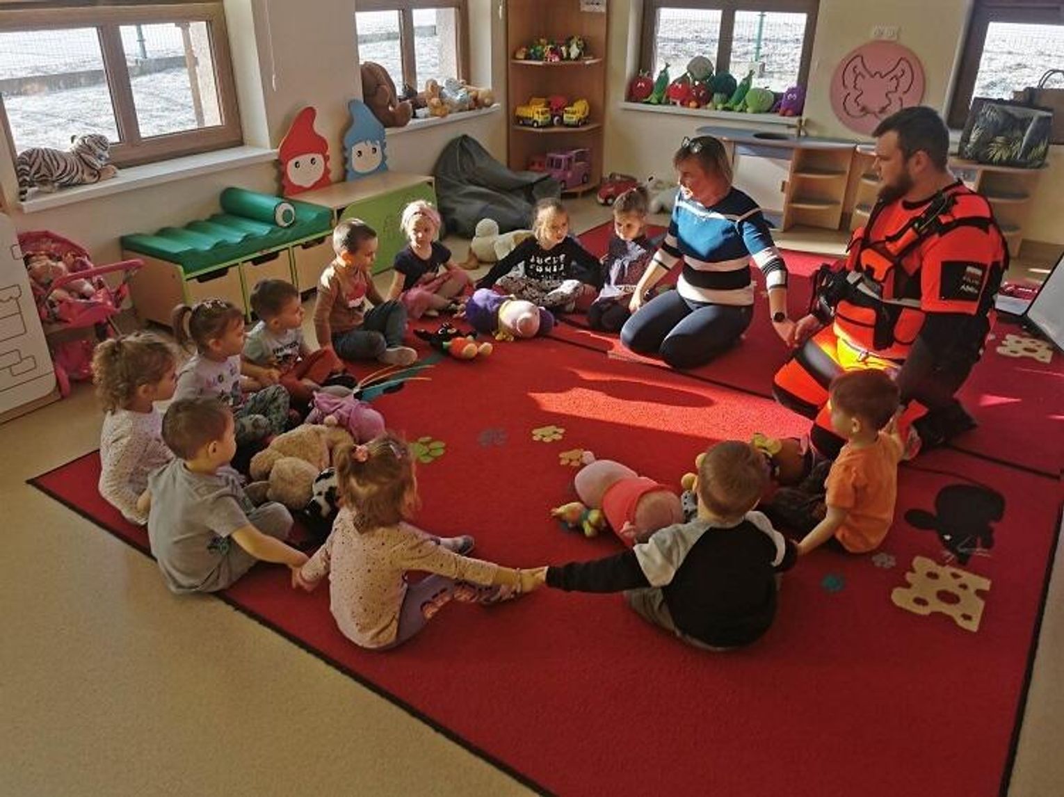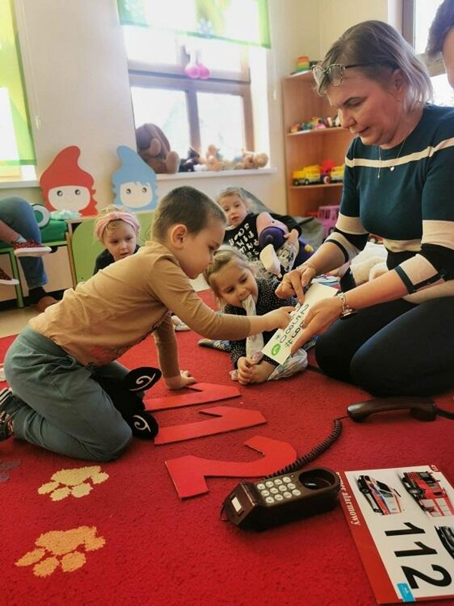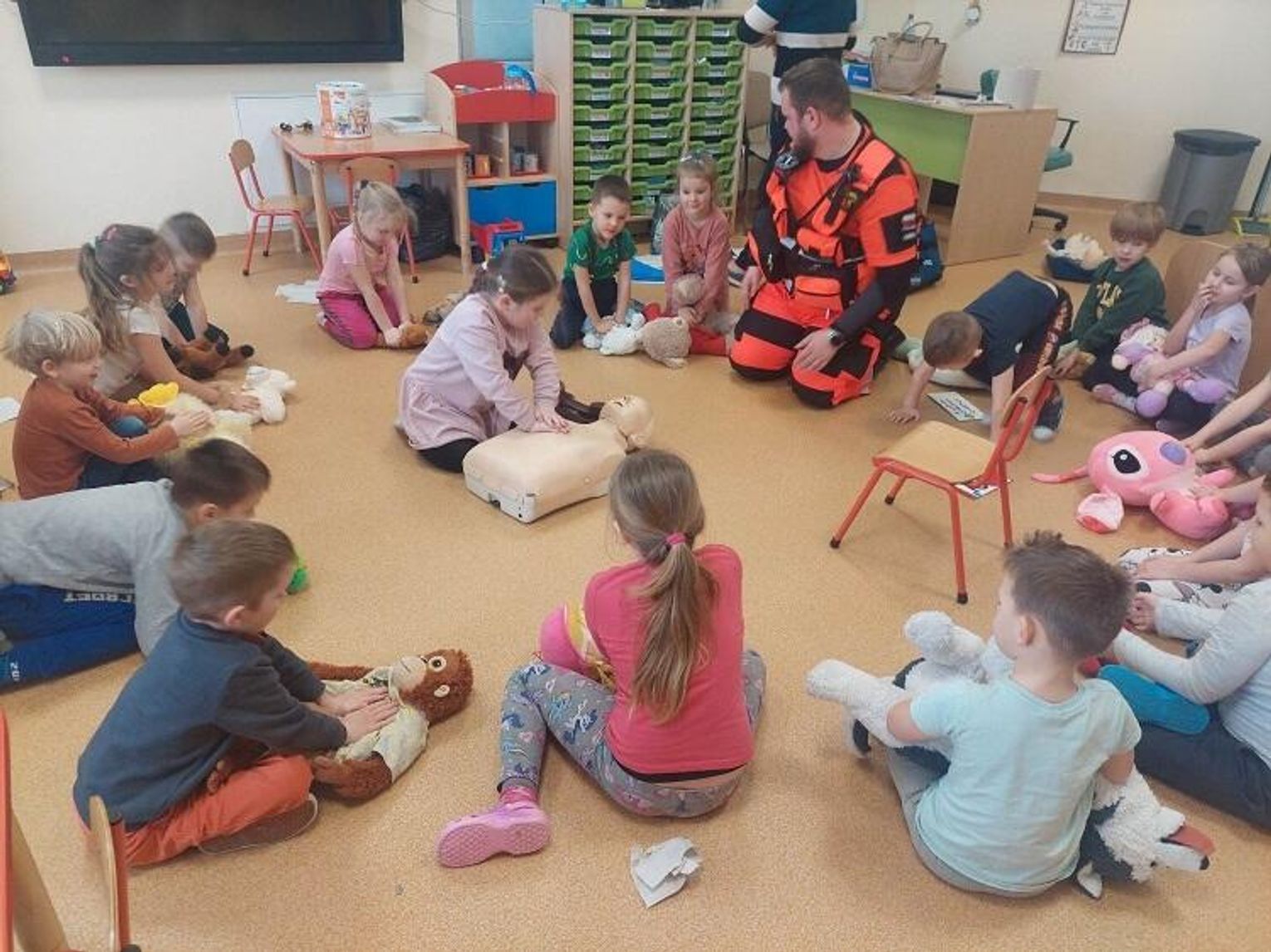 Pani Ela wraz z ratownikiem medycznym zaprezentowała przedszkolakom, jak poradzić sobie z krwotokiem z nosa, jak zachować się w sytuacji omdlenia bliskiej osoby, z którą jesteśmy sami w domu oraz jak przeprowadzić resuscytację krążeniowo-oddechową zarówno w przypadku osoby dorosłej, jak i dziecka. Dzieci najpierw przyglądały się pokazom, a potem mogły przećwiczyć udzielanie pomocy nie tylko na fantomach, ale także na swoich pluszakach. Przedszkolaki wykazały się znajomością numeru alarmowego 112, a pod okiem prowadzących miały okazję odegrać scenki, w czasie których wcielały się w rolę osoby dzwoniącej po pomoc. Zajęcia z pierwszej pomocy przedmedycznej bardzo się dzieciom spodobały, o czym świadczyło m.in. ich wielkie zaangażowanie w proponowane ćwiczenia.