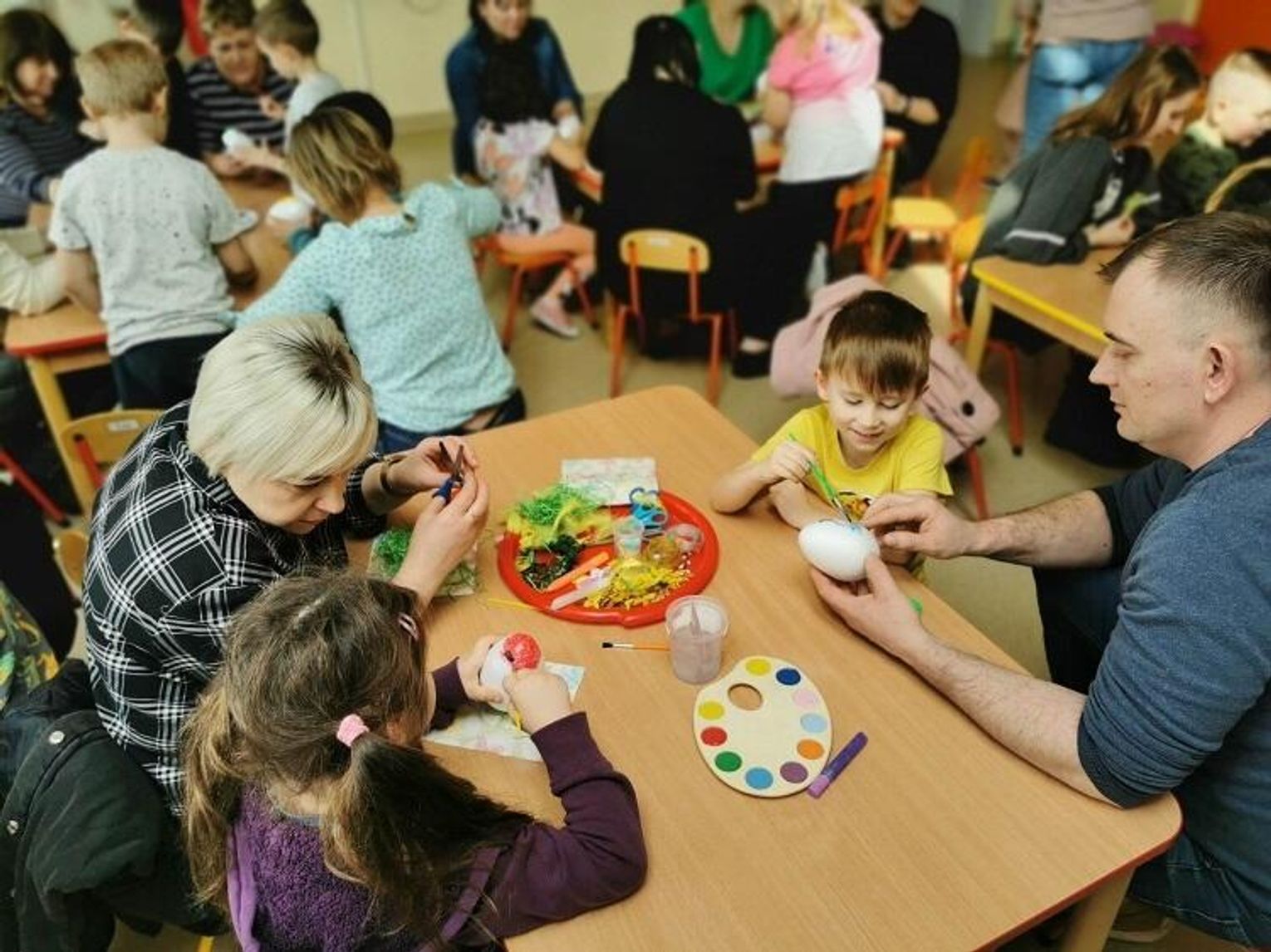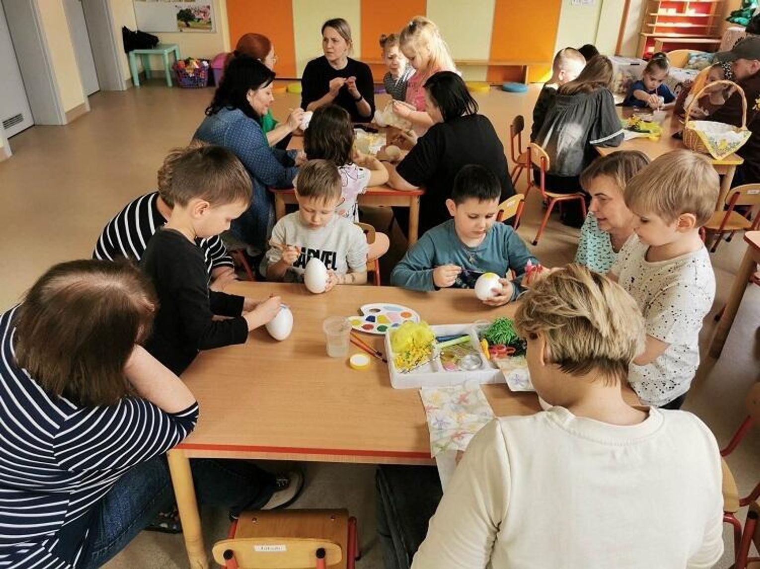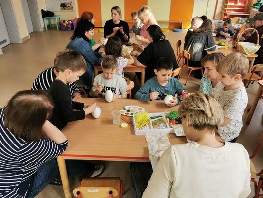Dzieci wraz ze swoimi najbliższymi miały okazję stworzyć przepiękne wielkanocne ozdoby. Zajęcia zaczęły się od występu przedszkolaków, które zaśpiewały piosenkę pt.: "Wydmuszki i brzuszki". Następnie rozpoczęła się praca twórcza. Każdy Miś otrzymał styropianową pisankę i wspólnie z mamą, tatą, babcią lub ciocią ozdobił ją piórkami, cekinami czy też farbami. Każda pisanka była piękna i wyjątkowa. Na sali było słychać rozmowy oraz śmiechy podczas wspólnej pracy. Na koniec był słodki poczęstunek - "Misie" zadbały o swoich gości, częstując ich pysznymi ciasteczkami.