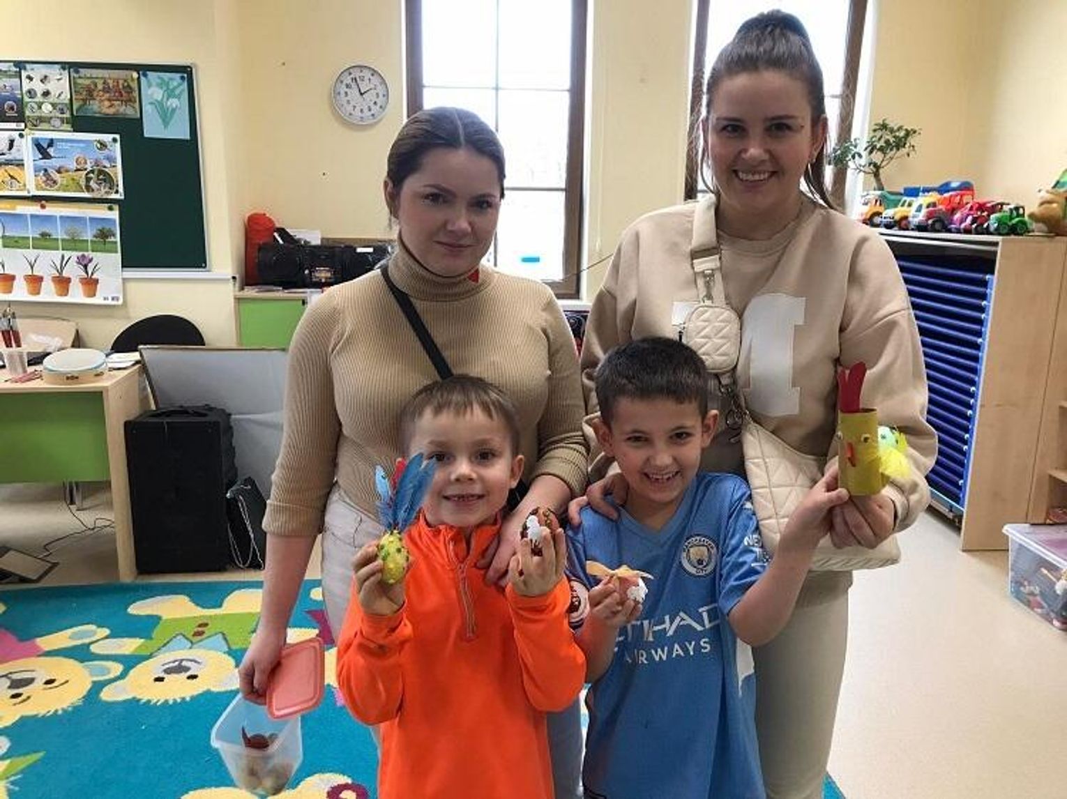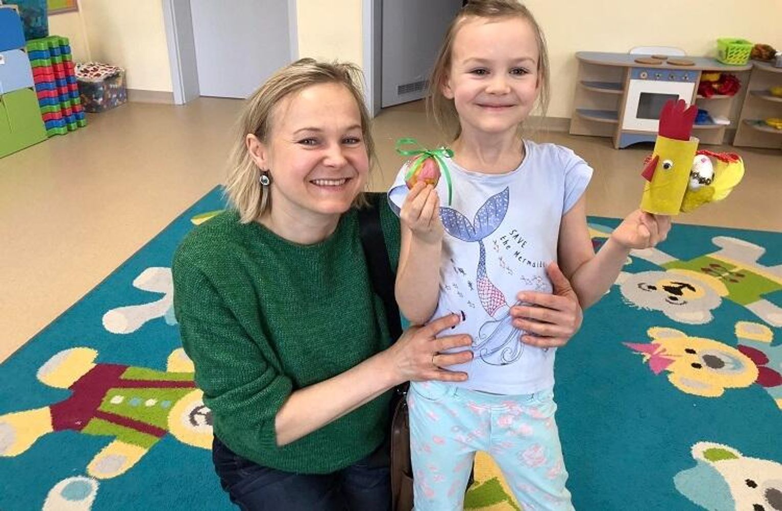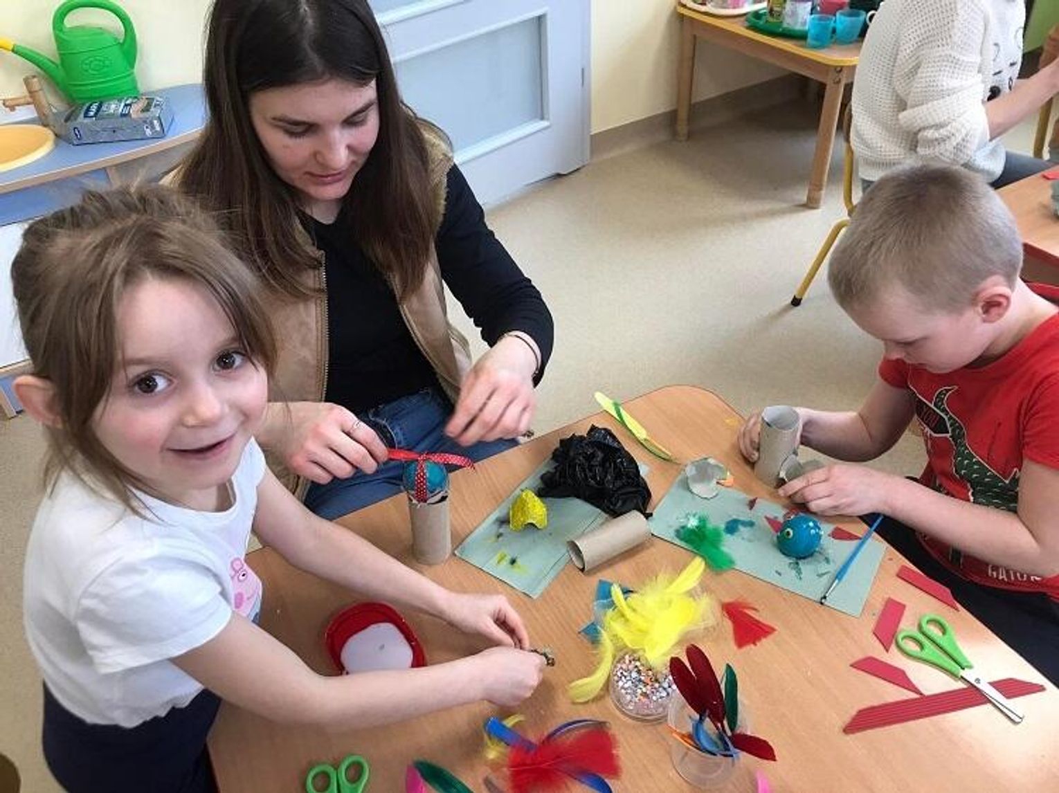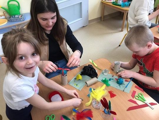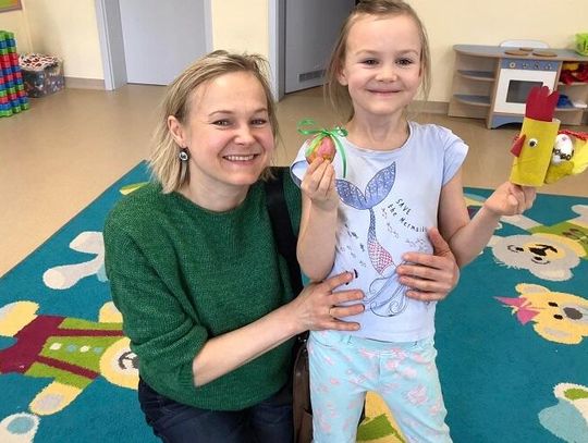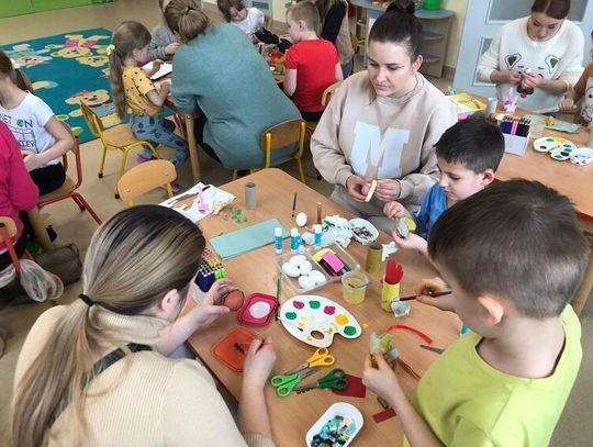 Dzieci wraz ze swoimi rodzicami wykonały piękne ozdoby wielkanocne: kurę ze styropianowym jajkiem oraz koszyczek z ugotowanym jajkiem. Wszyscy wykazali się dużą kreatywnością, pomysłowością oraz inwencją twórczą. Czas spędzony na warsztatach był radosny, bogaty w rozmowy i przeniósł nas w nastrój oczekiwania na święta. Taka forma zajęć z rodzicami bardzo spodobała się przedszkolakom, bo cóż jest piękniejszego niż uśmiech i zadowolenie dziecka, kiedy może być w przedszkolu z rodzicami.