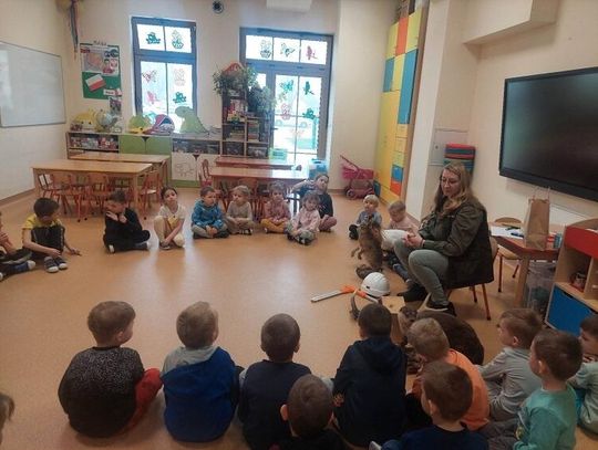 Pani Ewa opowiedziała dzieciom o swoim obowiązku, jakim jest opiekowanie się lasem i zaprezentowała akcesoria związane z jej zawodem. Przedszkolaki dowiedziały się, że człowiek jest gościem w lesie i musi szanować zwyczaje gospodarzy. Przy okazji przypomniały sobie zasady zachowania się w lesie - m.in. przestrzeganie ciszy, porządku oraz unikania kontaktu z dzikimi zwierzętami.