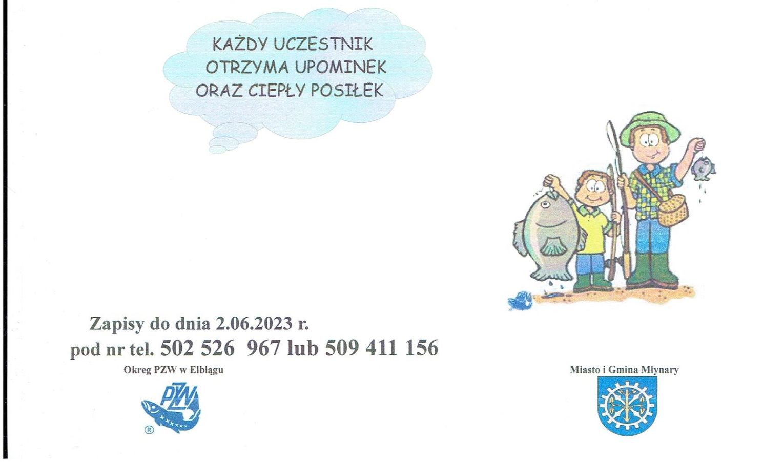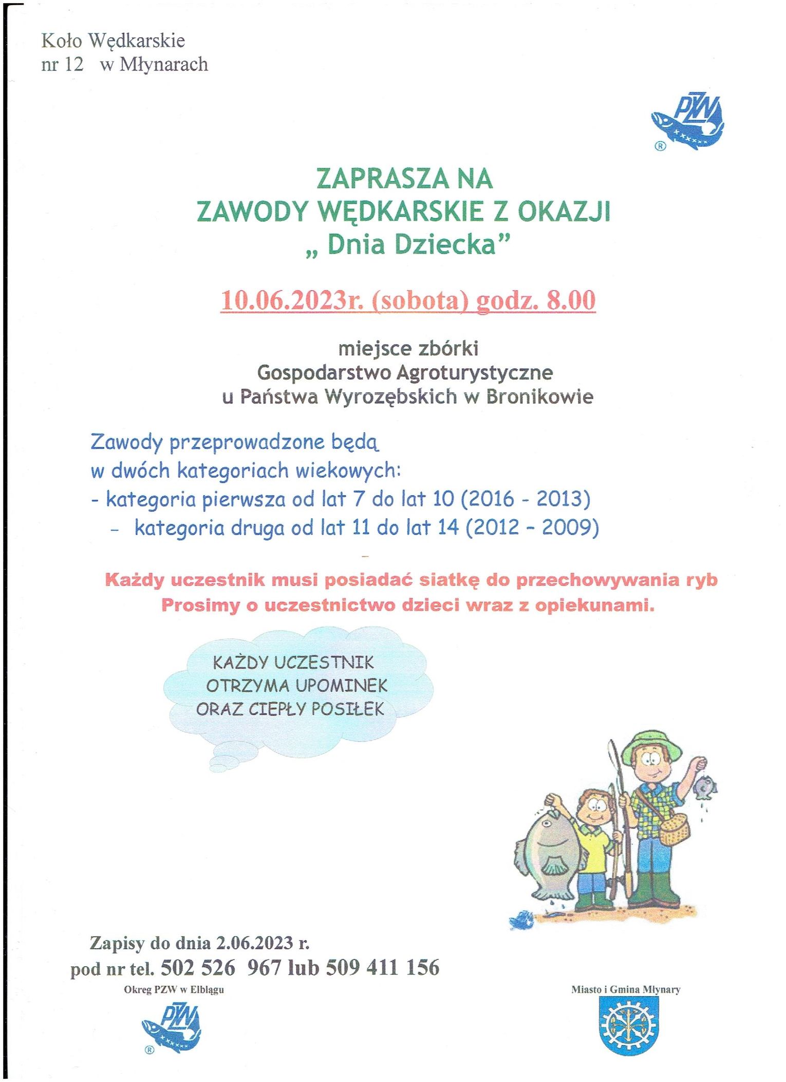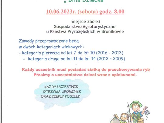 Zaproszenie na zawody wędkarskie dla dzieci. Wszystkie informacje na zdjęciu poniżej.