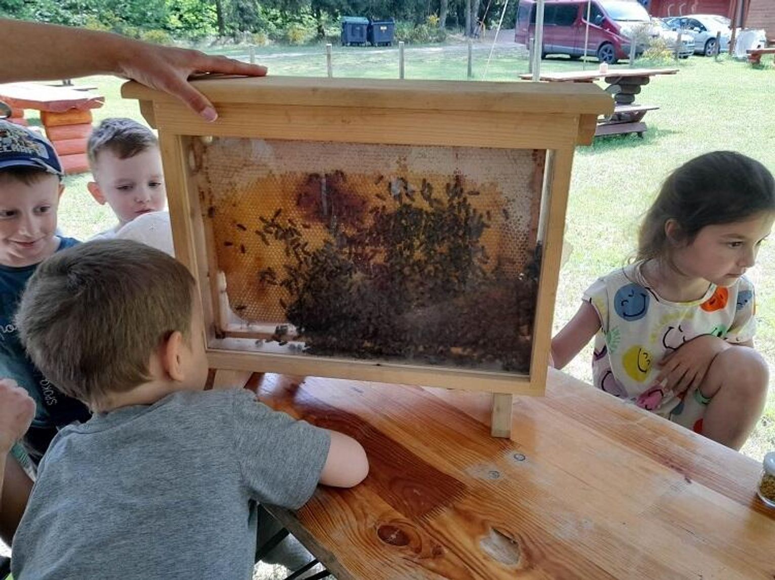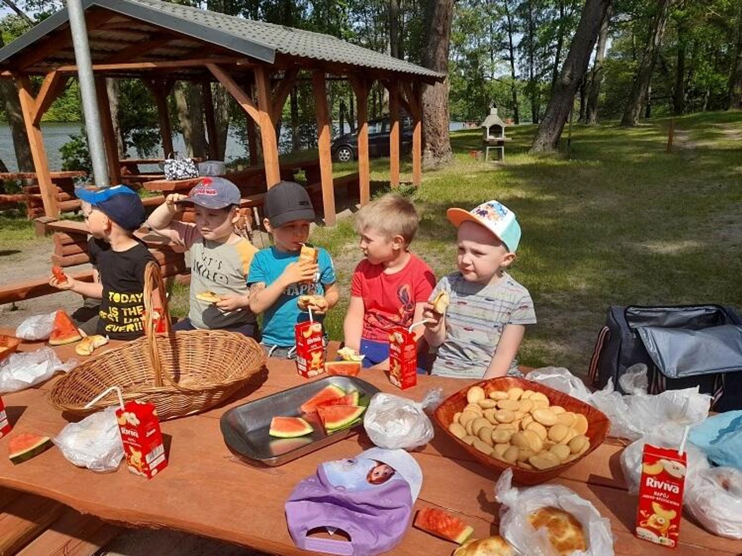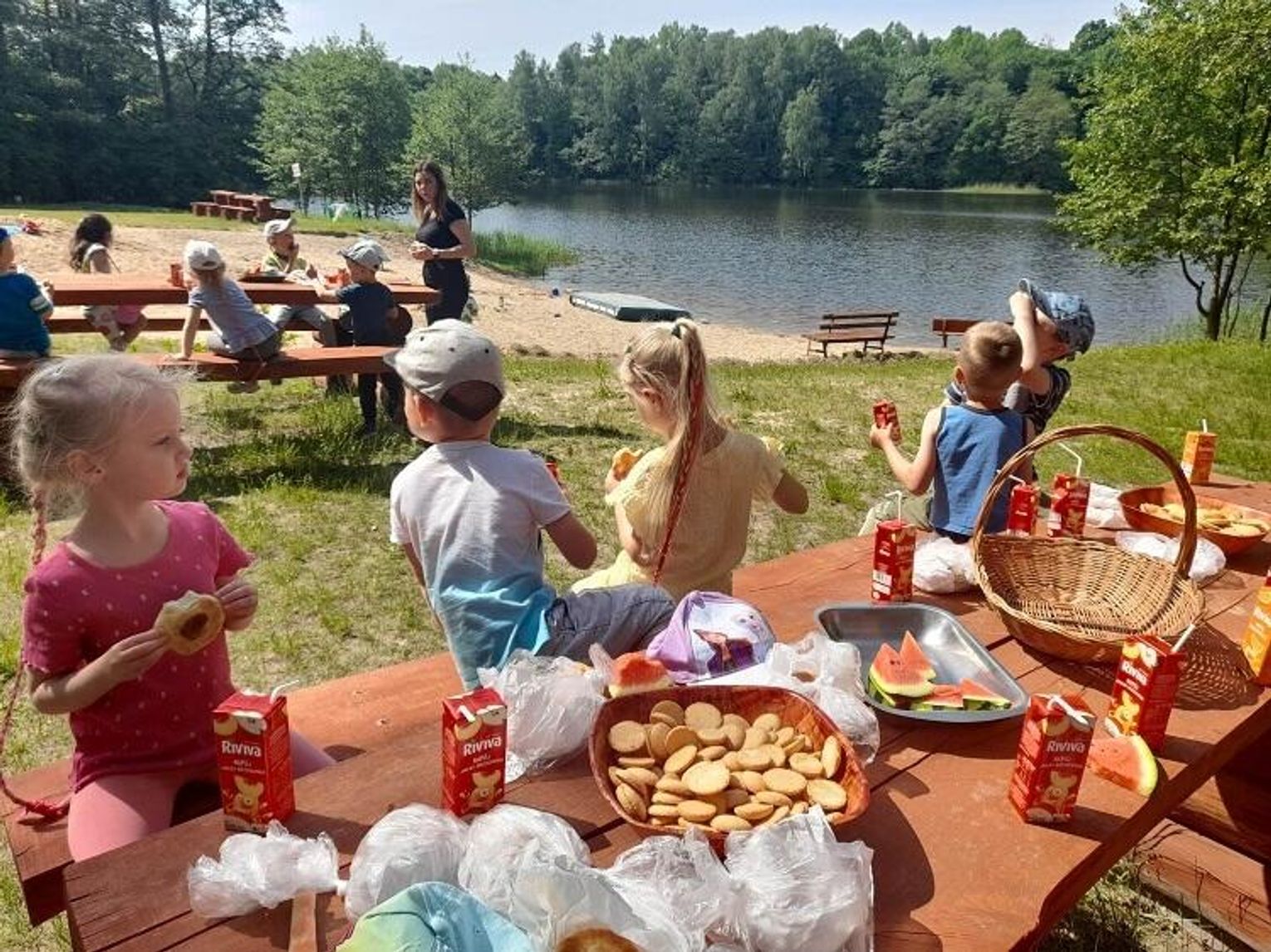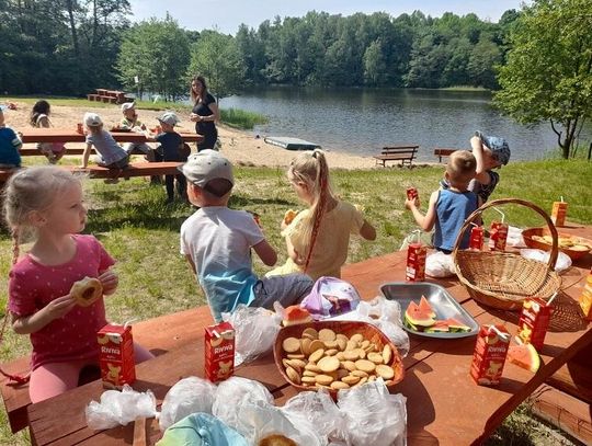 Nad jeziorem czekało na przedszkolaków mnóstwo atrakcji. Najpierw dzieci wzięły udział w warsztatach pszczelarskich, podczas których dowiedziały się, na czym polega praca pszczelarza, dlaczego trzeba dbać o pszczoły oraz jak pozyskuje się miód. Dzieci mogły obserwować pszczoły w "szklanym ulu" oraz przymierzyć strój pszczelarza, co sprawiło im wiele radości. Po warsztatach "Pszczółki" udały się na plażę, gdzie świetnie się bawiły, budując piaskowe budowle. Jednak to nie był koniec atrakcji - do tańca i wspólnych zabaw zaprosiła dzieci Pszczółka Maja. Chętni chłopcy mieli okazję pograć w piłkę nożną, a dziewczynki zapleść sobie na włosach kolorowe warkoczyki. Nie zabrakło również pysznej waty cukrowej i kiełbasek z ogniska. To był dzień pełen wrażeń i super zabawy. Dzieci wróciły do przedszkola zmęczone i brudne, ale za to bardzo szczęśliwe!