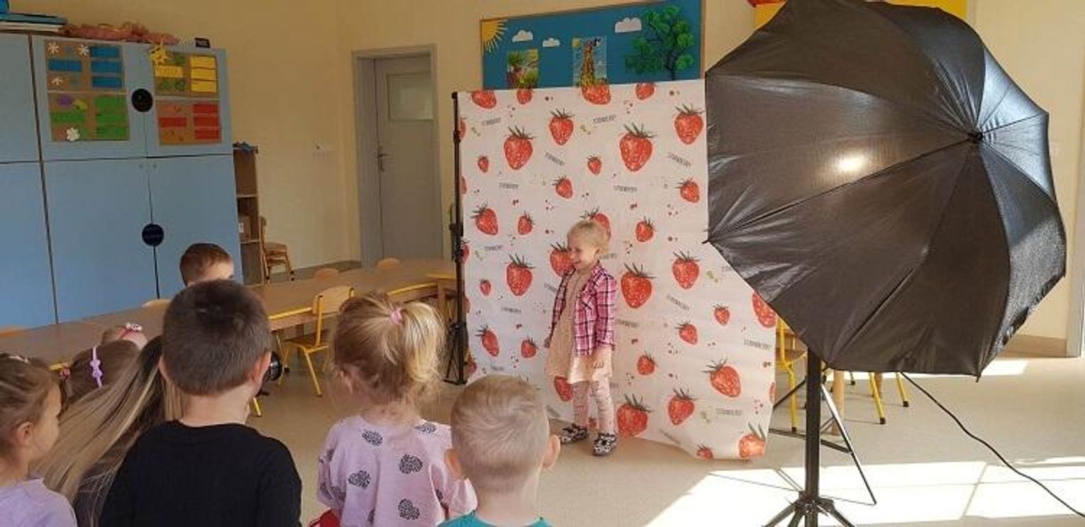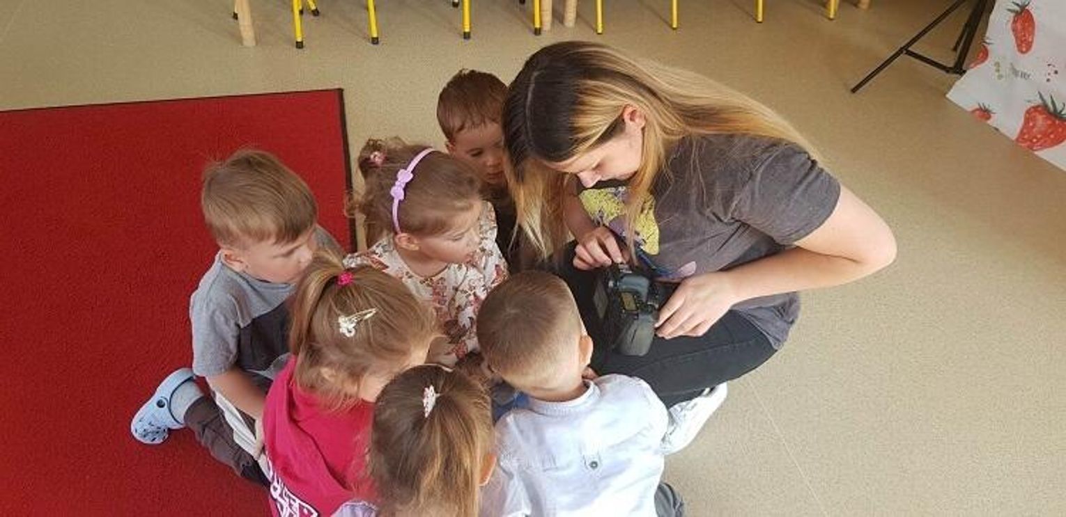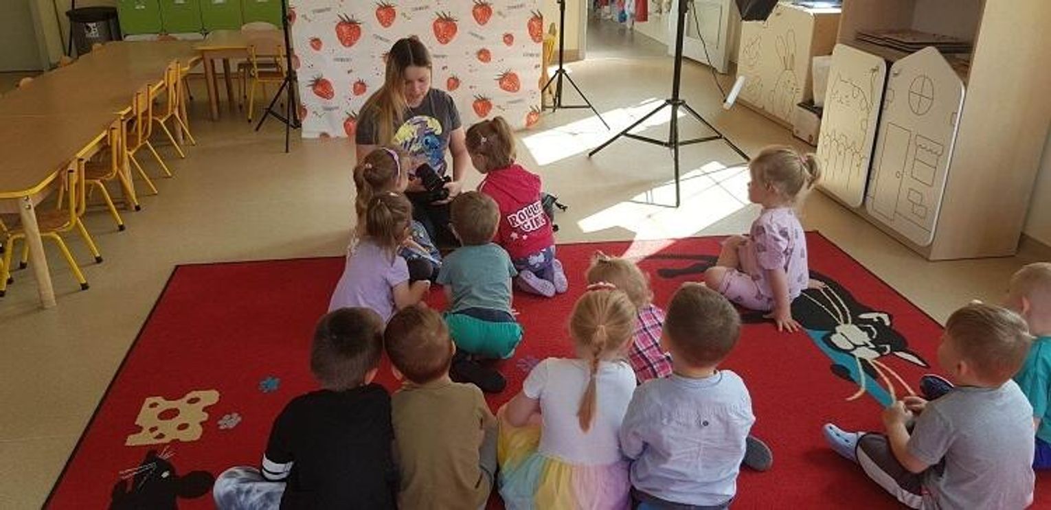 W piątek 26 maja, w ramach programu preorientacji zawodowej, dzieci z grupy "Tygryski" odwiedziła pani fotograf - mama naszego Juliana - pani Adrianna Elbruda. Opowiedziała ona dzieciom, na czym polega jej praca oraz pokazała albumy z wykonanych przez siebie sesji fotograficznych. Następnie pani Ada zapoznała dzieci z profesjonalnym sprzętem fotograficznym - każde dziecko mogło zrobić zdjęcie koleżance lub koledze.