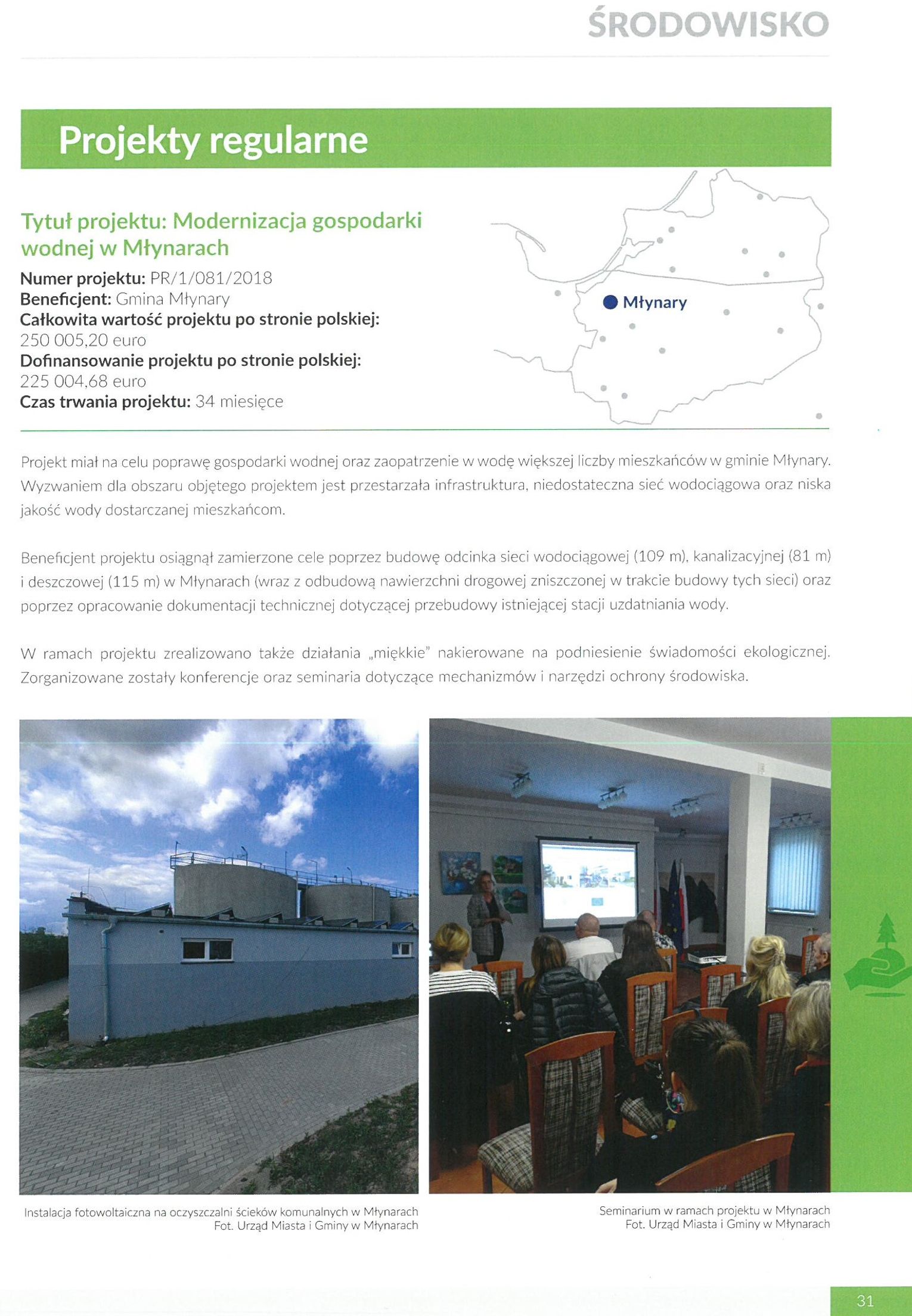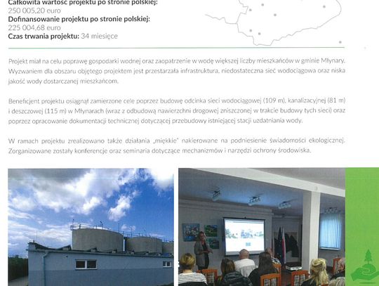 - Projekt w ramach drugiego priorytetu, koncentrującego się wokół czystego środowiska, w ramach którego wykonano: dokumentację techniczną modernizacji stacji uzdatniania wody w Młynarach, instalacje fotowoltaiczne w stacji uzdatniania wody w Karszewie i oczyszczalni ścieków w Młynarach, zakup beczki asenizacyjnej do wywozu ścieków z nieskanalizowanych nieruchomości, budowę sieci wodociągowej oraz kanalizacji sanitarnej i deszczowej przy ul. Ogrodowej i Kwiatowej w Młynarach, odtworzenie nawierzchni dróg z płyt betonowych wzdłuż ul. Ogrodowej i Kwiatowej w Młynarach. Całkowita wartość kosztów kwalifikowanych Gminy Młynary wyniosła 250 005,20 euro, w tym 90% dofinansowania tj. 225 004,68 euro.