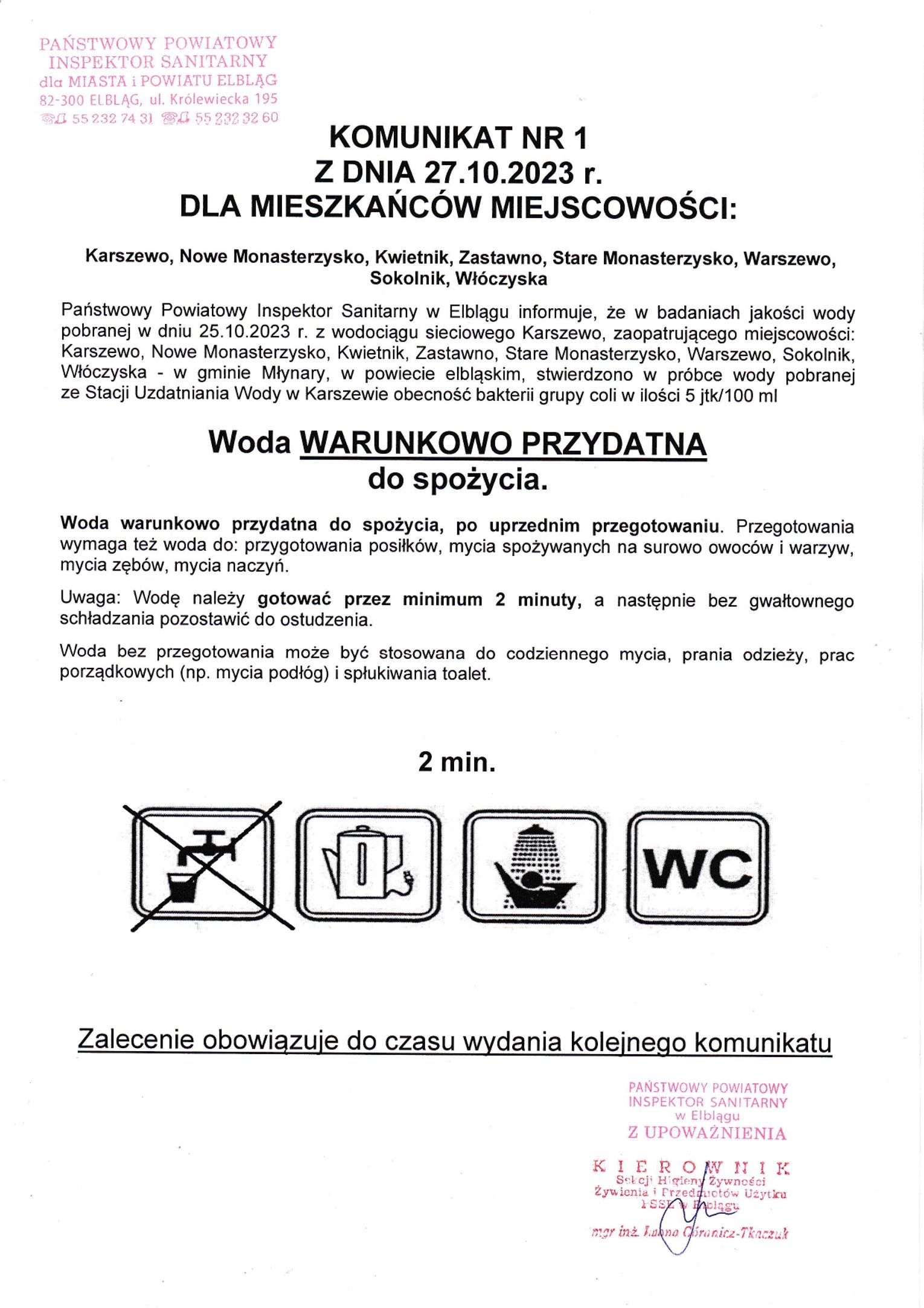 Komunikat Państwowego Powiatowego Inspektora Sanitarnego o warunkowej przydatności wody do spożycia