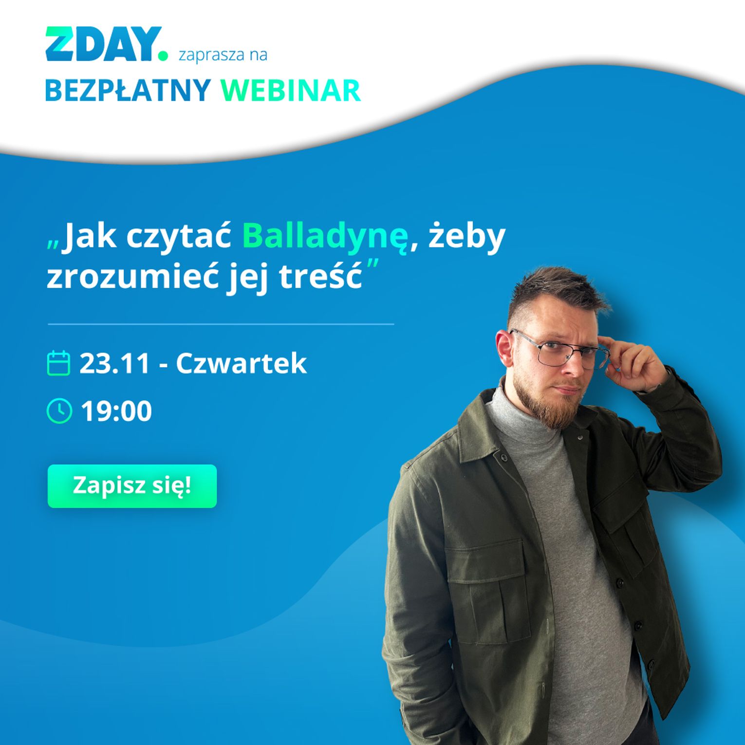 Jak czytać Balladynę, aby lepiej zrozumieć przesłanie tej lektury? To zagadnienie będzie tematem przewodnim najbliższego webinaru, który organizują twórcy aplikacji ZDAY (ich webinary zgromadziły już ponad 22 tys. uczestników!). Prowadzący, Marek Lepczak, podpowie również, jak skutecznie przygotować się do egzaminu ósmoklasisty oraz w jaki sposób umiejętność czytania ze zrozumieniem pozwala uzyskać dodatkowe punkty.