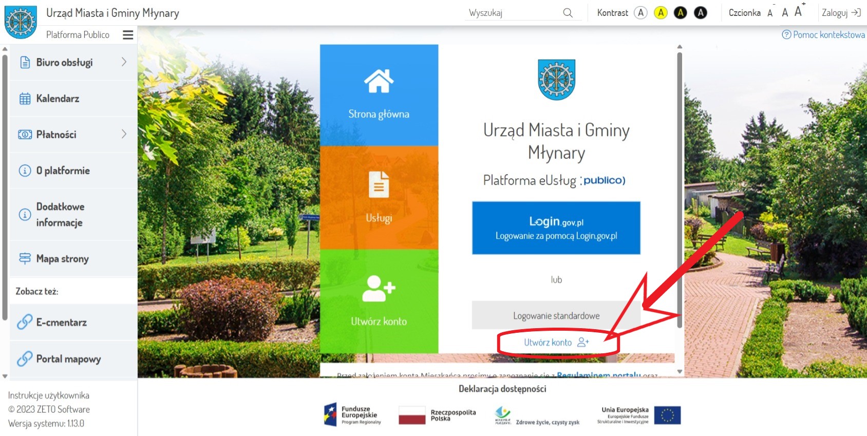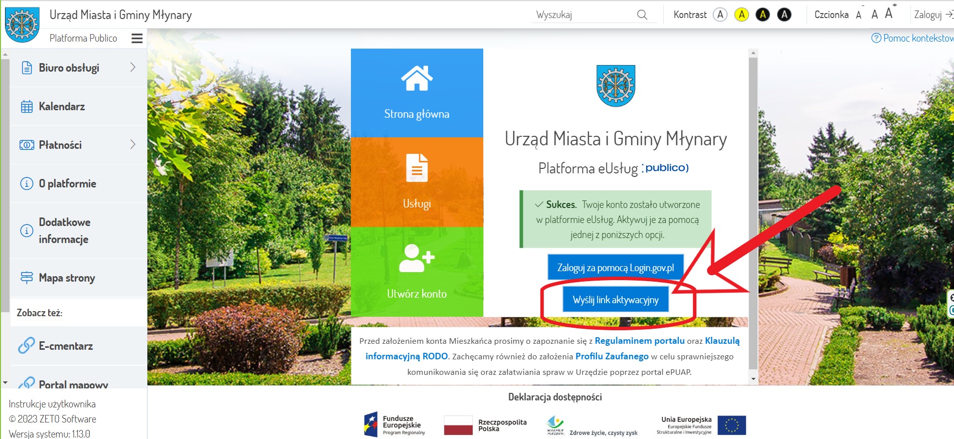 - Należy wejść na stronę portalu e-usług: https://euslugi.mlynary.pl/