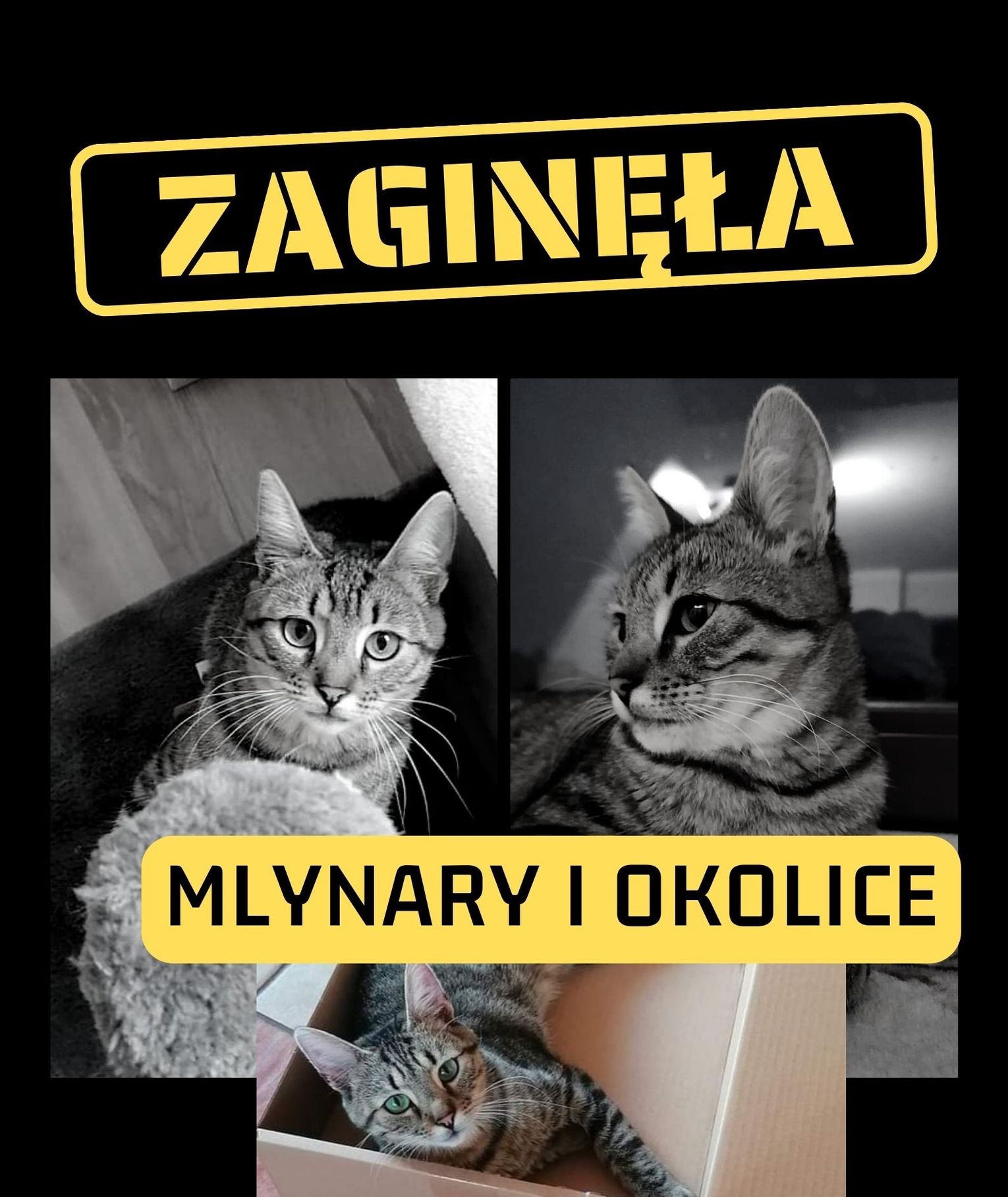 Urząd Miasta i Gminy w Młynarach poszukuje widocznej na zdjęciu kotki, która pod koniec listopada zaginęła w Młynarach. Kotka jest maści brązowo/burej, posiada chip 616093200539638, jest wysterylizowana i wymaga drogiego leczenia i podawania leków.