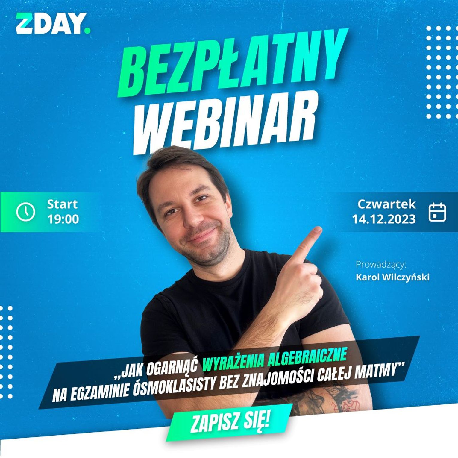 Jak ogarnąć wyrażenia algebraiczne na Egzaminie Ósmoklasisty bez znajomości całej matmy? Odpowiedź poznasz podczas bezpłatnego webinaru organizowanego przez ZDAY - 14.12 (czwartek) o 19:00. Formularz zapisu znajdziesz na stronie: https://zday.pl/egzamin-osmoklasisty/
