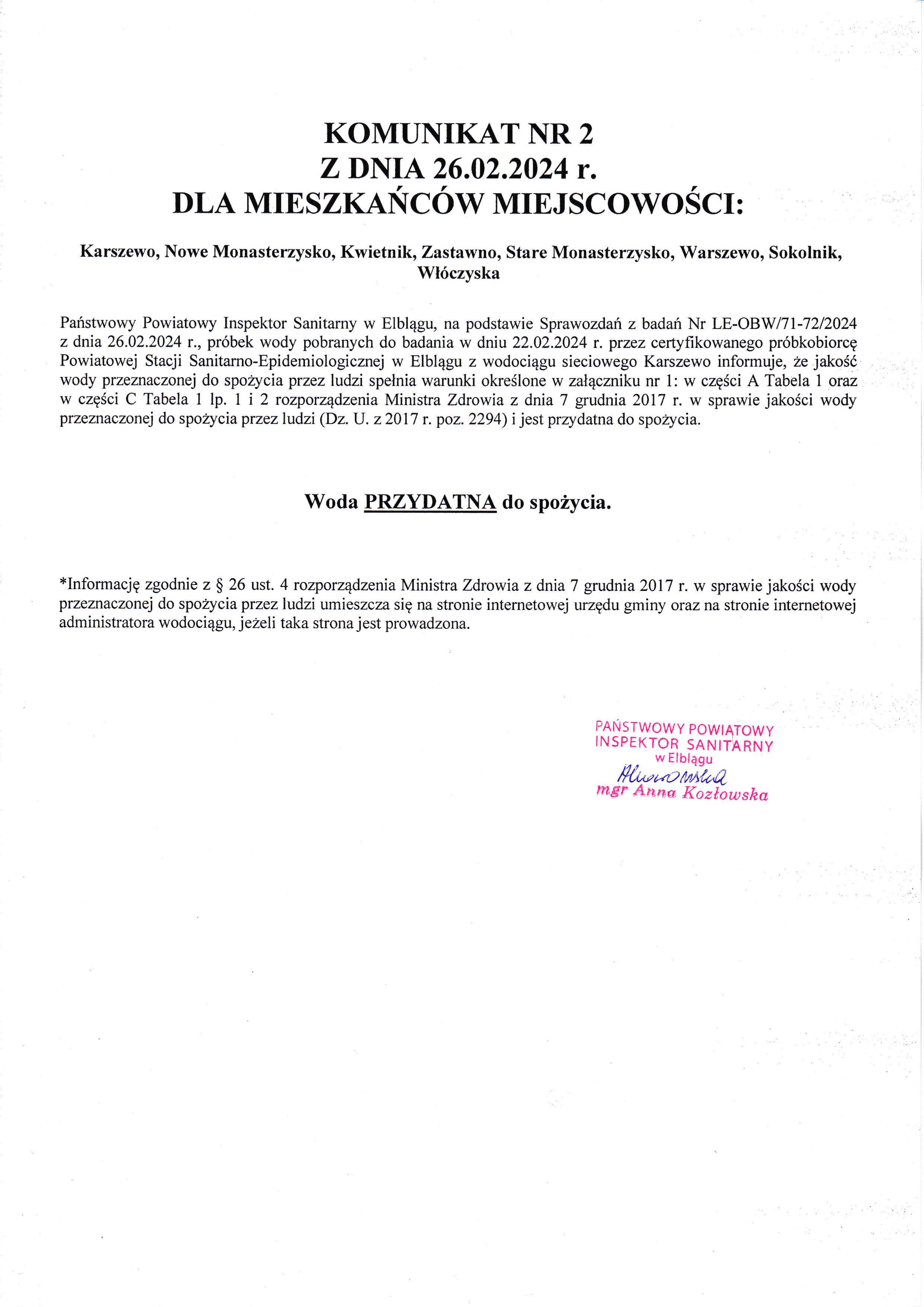 Uwaga mieszkańcy miejscowości: Karszewo, Nowe Monasterzysko, Kwietnik, Zastawno, Stare Monasterzysko, Warszewo, Sokolnik, Włóczyska - woda przydatna do spożycia.