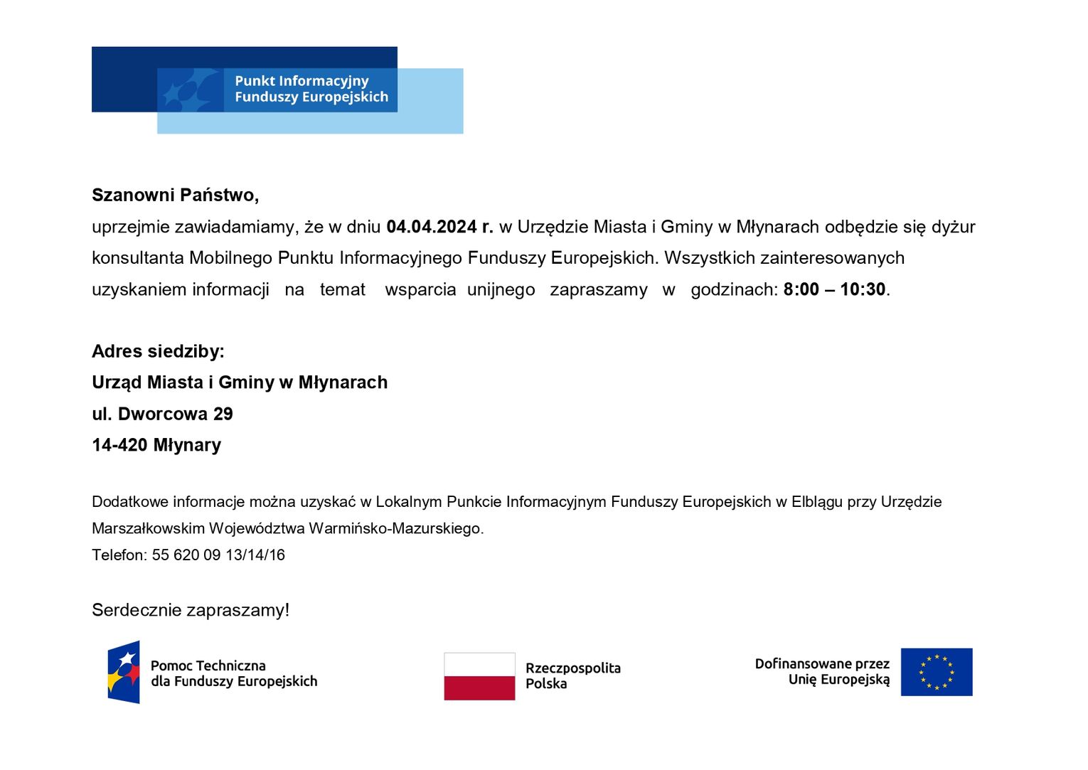 Dyżur Mobilnego Punktu Informacyjnego Funduszy Europejskich w Urzędzie Miasta i Gminy w Młynarach