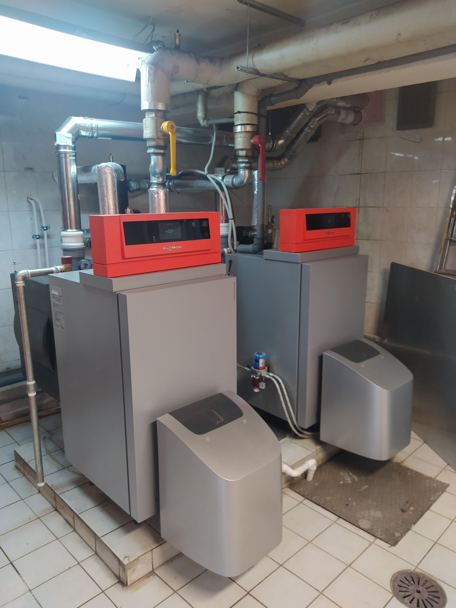 W ramach zadania, wyłoniony w drodze przetargu nieograniczonego Wykonawca - Pan Grzegorz Duda prowadzący działalność gospodarczą pod nazwą: Usługi Budowlane i Hydrauliczne Grzegorz Duda z siedzibą w Ornecie, zdemontował stary piec olejowy, znajdujący się w kotłowni olejowej w Szkole Podstawowej w Młynarach, dostarczył i zamontował 2 nowe piece olejowe Viessman Vitorondens 200-T J2RA63/80/100 kW oraz wymienił wkłady kominowe.