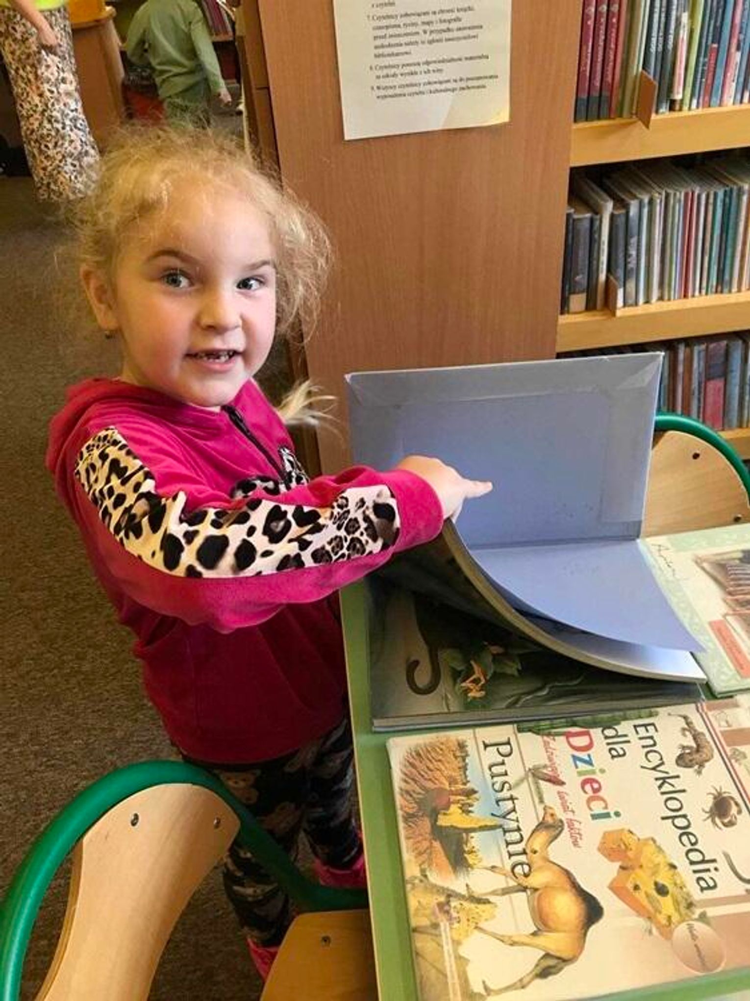 Przedszkolaki wzięły udział w zajęciach pt. "Biblioteka - królestwo książek", w czasie których mogły zajrzeć w każdy kącik biblioteki, pooglądać wiele różnych pozycji książkowych oraz zadawać pytania dla pani bibliotekarki. Pani Beata z wielką przyjemnością odpowiadała dzieciom na wszystkie pytania. Dzieci dowiedziały się, co należy zrobić, aby stać się czytelnikiem biblioteki, oraz jak należy się w niej zachować.