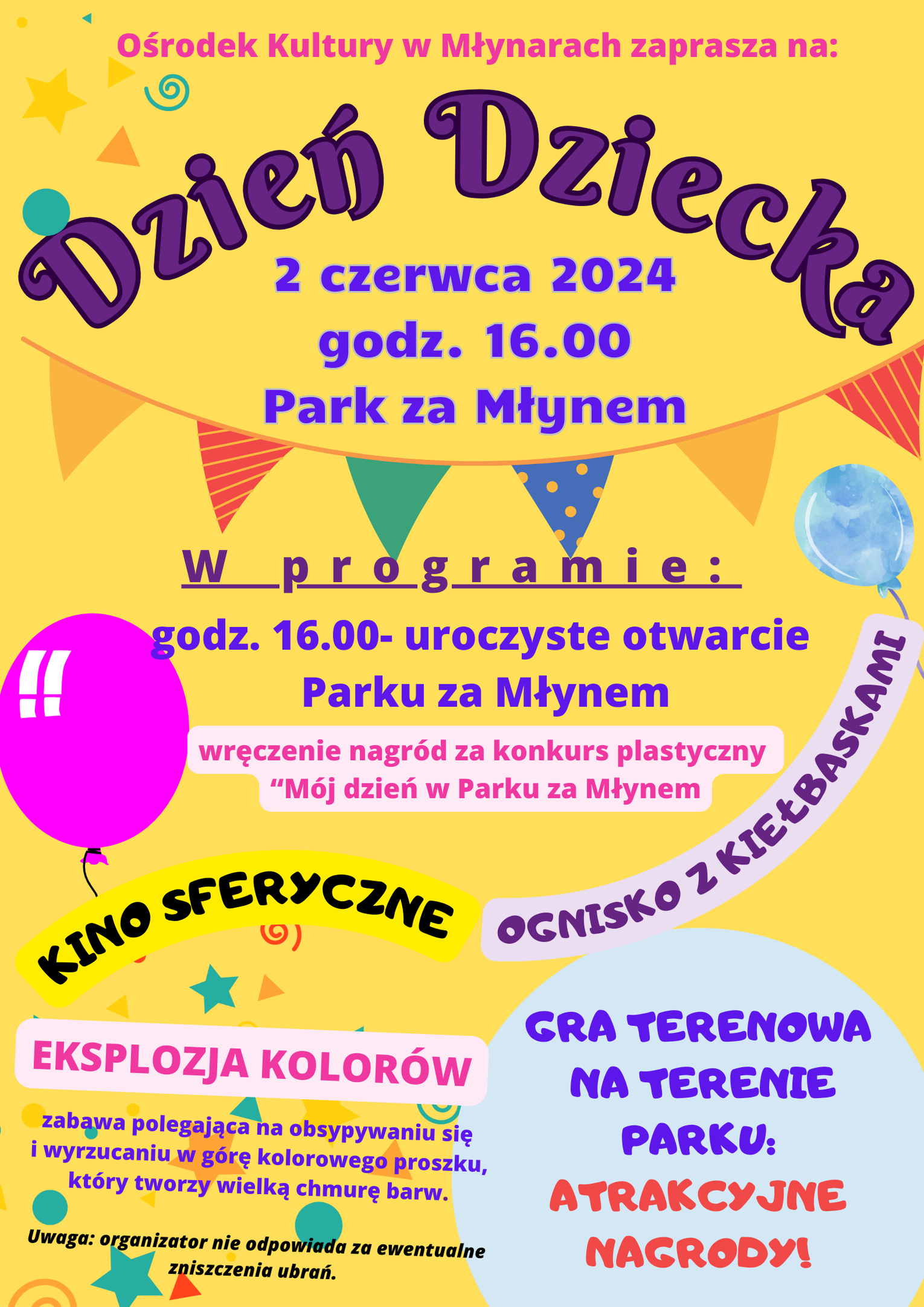 Już niedługo DZIEŃ DZIECKA! Zapraszamy więc Dzieci młodsze i te starsze do wspólnej zabawy. Nie może również zabraknąć dorosłych. Co dla Was przygotowaliśmy? Wspaniały dzień w Parku za Młynem! O godzinie 16.00 nastąpi uroczyste, oficjalne otwarcie Parku. Trwa konkurs plastyczny pt. "Mój dzień w Parku za Młynem", więc będzie idealna okazja do wręczenia nagród zwycięzcom.