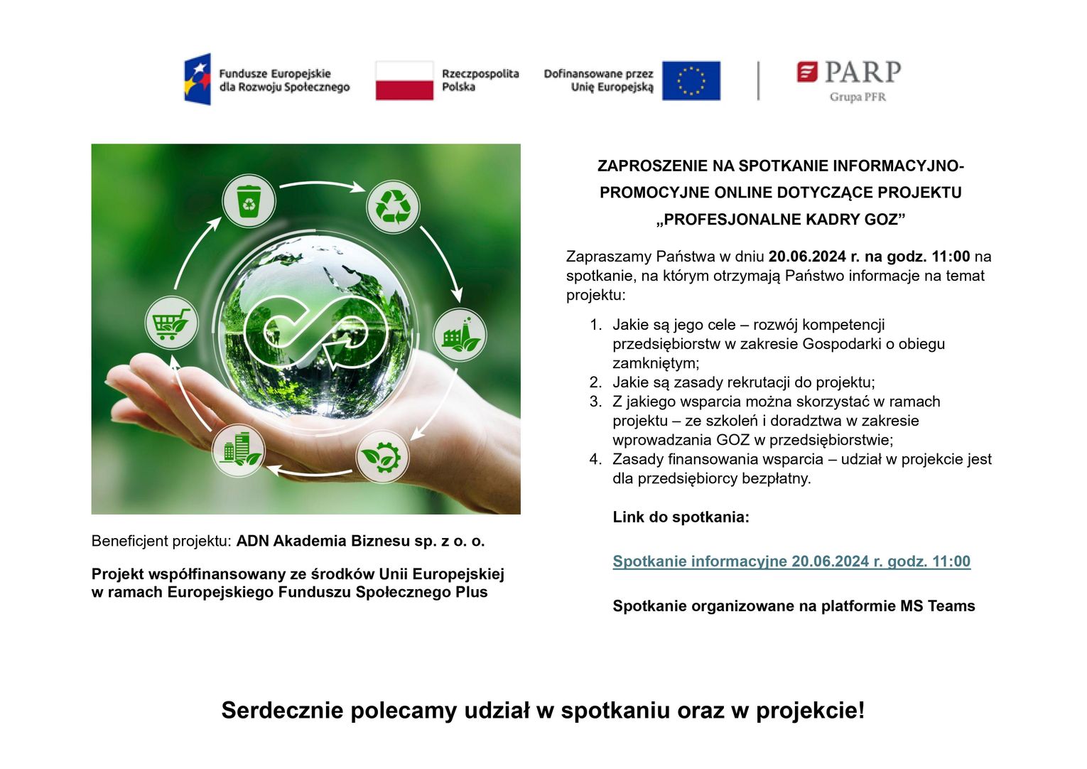 Zaproszenie na spotkanie informacyjno-promocyjne online dotyczące projektu "PROFESJONALNE KADRY GOZ"