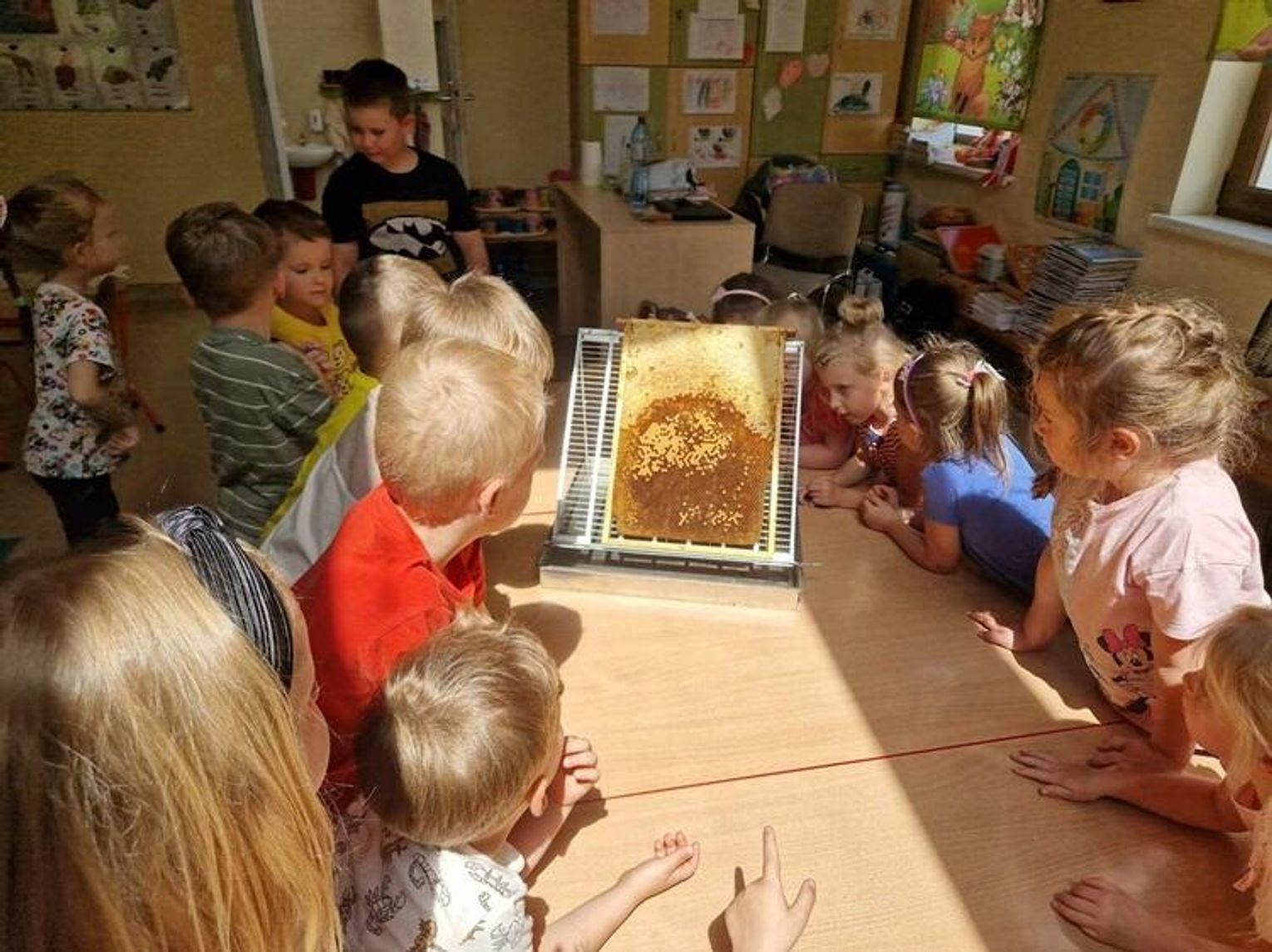 O pracy i życiu pszczół dzieci z grupy "Tygryski" miały okazję dowiedzieć się podczas zajęć przeprowadzonych dnia 5 czerwca br. Przedszkolaki zobaczyły, jak wygląda prawdziwa ramka z miodem, pyłkiem i czerwiem. Były również świadkiem narodzin młodych pszczółek. Na koniec z wielką ochota zajadały się kapiącym z ramki świeżym miodem!