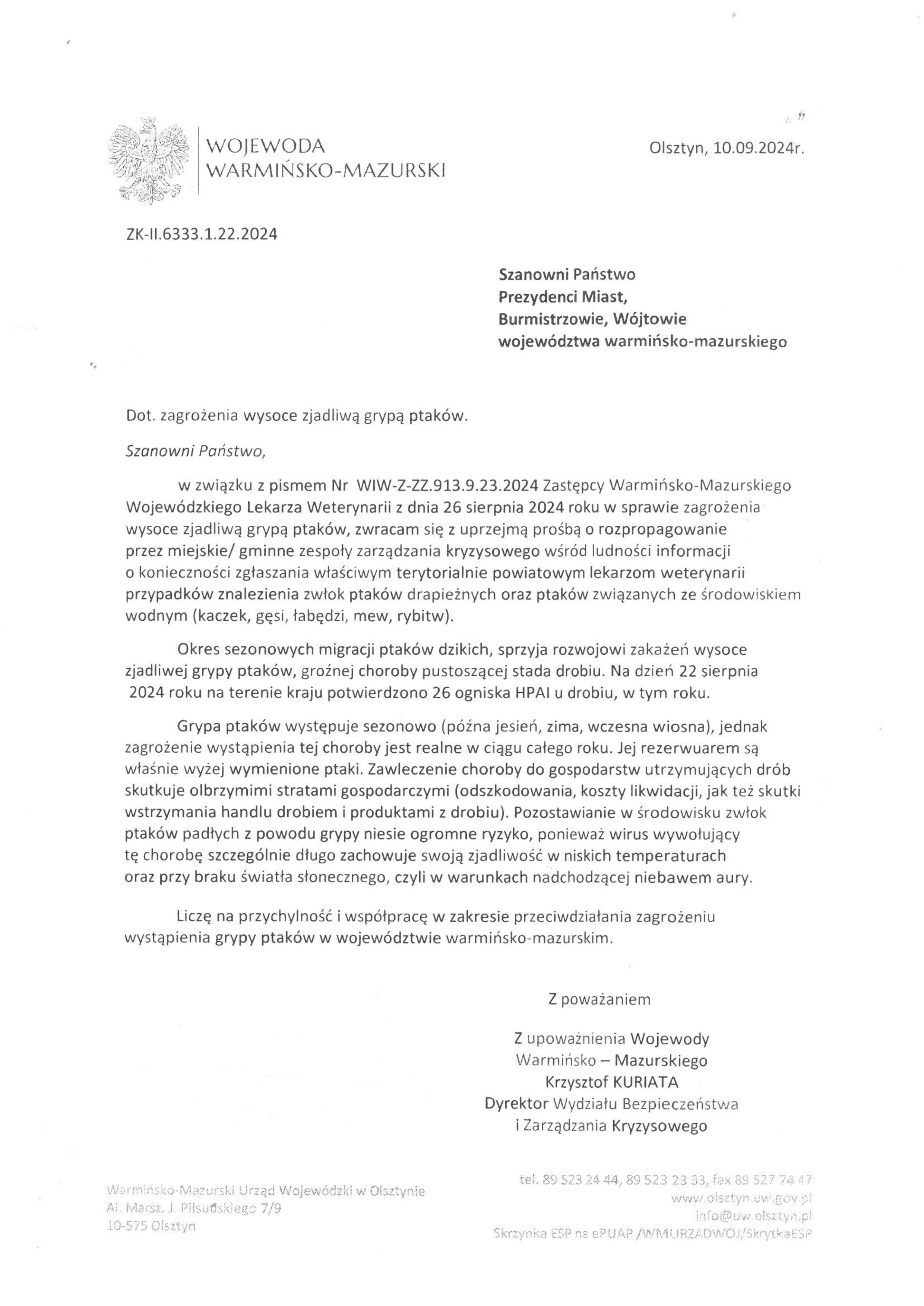 W związku z informacją przekazaną przez Zastępcę Warmińsko-Mazurskiego Wojewódzkiego Lekarza Weterynarii w sprawie zagrożenia wysoce zjadliwą grypą ptaków, Burmistrz Miasta i Gminy Młynary przekazuje informację o konieczności zgłaszania właściwym terytorialnie powiatowym lekarzom weterynarii przypadków znalezienia zwłok ptaków drapieżnych oraz ptaków związanych ze środowiskiem wodnym ( rybitw, mew, łabędzi , gęsi, kaczek).